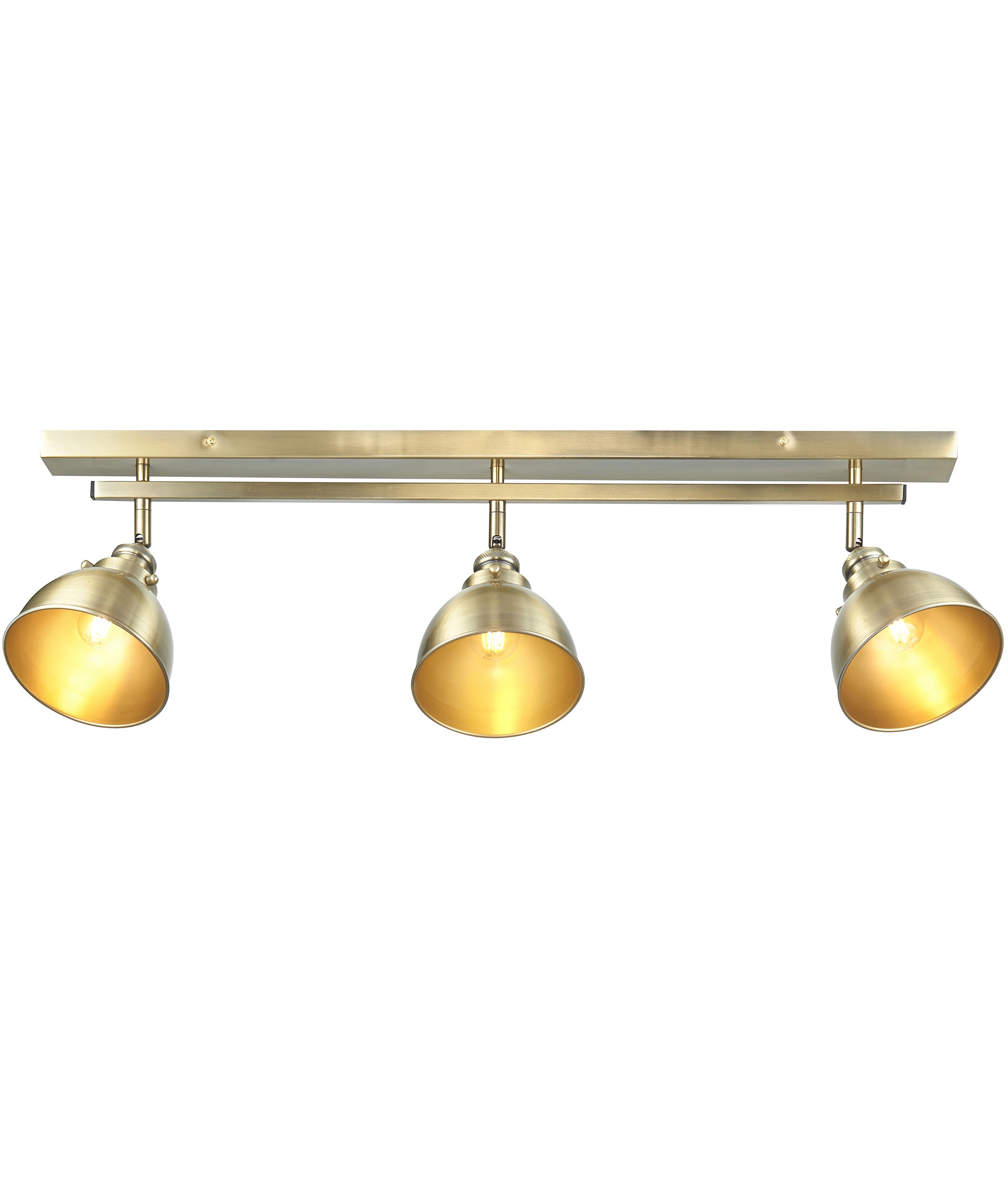 £192.00 inc VATIndustrial design with a modern twist, this triple lamp, adjustable ceiling light comes in a warm, antique brass finish. Inspired by industrial lighting from the past, this fitting has a chunky linear frame, visible bolts, knurled detailing around the lamp heads and soft, rolled edges on the wide metal shades.