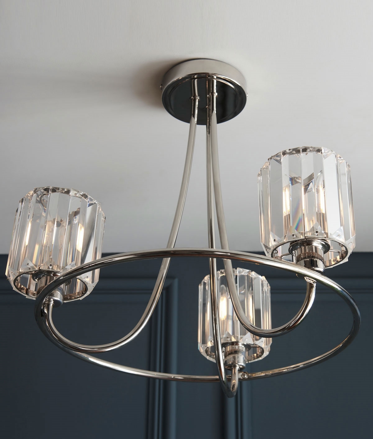 Designed for three E14 candle lamps (maximum 6 watts each), this fitting allows flexibility in both appearance and performance. Bare filament candle lamps enhance the sparkle of the crystal shades, while frosted or opal lamps create a softer glow. When dimmable lamps and a compatible dimmer are used, the light level can be easily adjusted to suit the setting. The semi-flush design keeps the fixture close to the ceiling, making it a practical yet decorative option for a wide range of interiors.