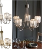 This five-light chandelier features curved metal arms supporting individual faceted crystal shades. The circular frame and balanced arm arrangement give the light a graceful symmetry, while the crystal prisms add depth and sparkle. Finished in either nickel plate or antique brass, the metalwork complements the clarity of the crystal for a modern yet timeless appearance. The chain suspension leads to a round ceiling canopy, giving the fitting a refined finish that works equally well in classic and contemporary interiors.