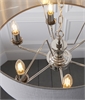 £253.00 inc VATThis timeless, 6-light, chandelier pendant is a sophisticated mix of charcoal fabric and bright nickel metalwork. You can choose between a linen or silk mix, pleated shade. The chain suspended frame has six delicate, chrome arms that finish in simple lamp holders with matching nickel bobeches. The large, drum shade has rolled edges and the inside of the linen fabric shade is lined with a reflective, brushed metallic finish to reflect and warm the illumination.