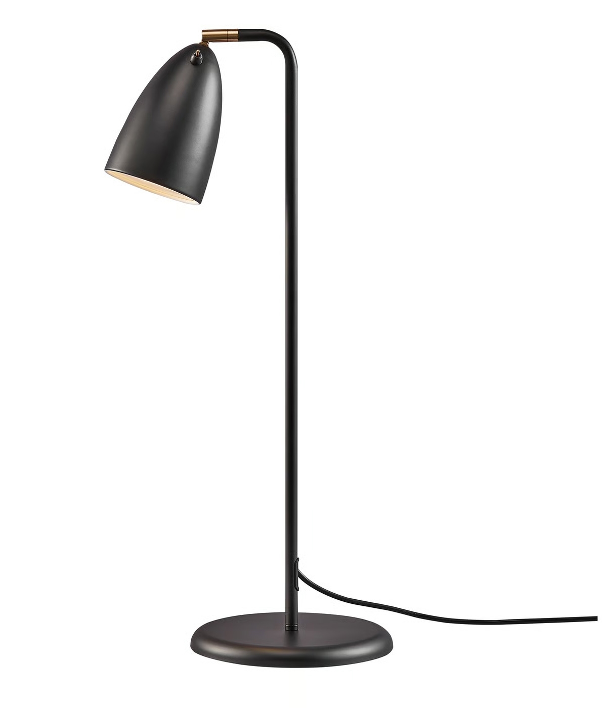 A low energy table lamp in a Scandinavian design, with an adjustable 90 degree (up and down) lamp head, a great choice living space or bedside use. The metal lamp head has a switch on the top of the shade and has a corresponding coloured base.