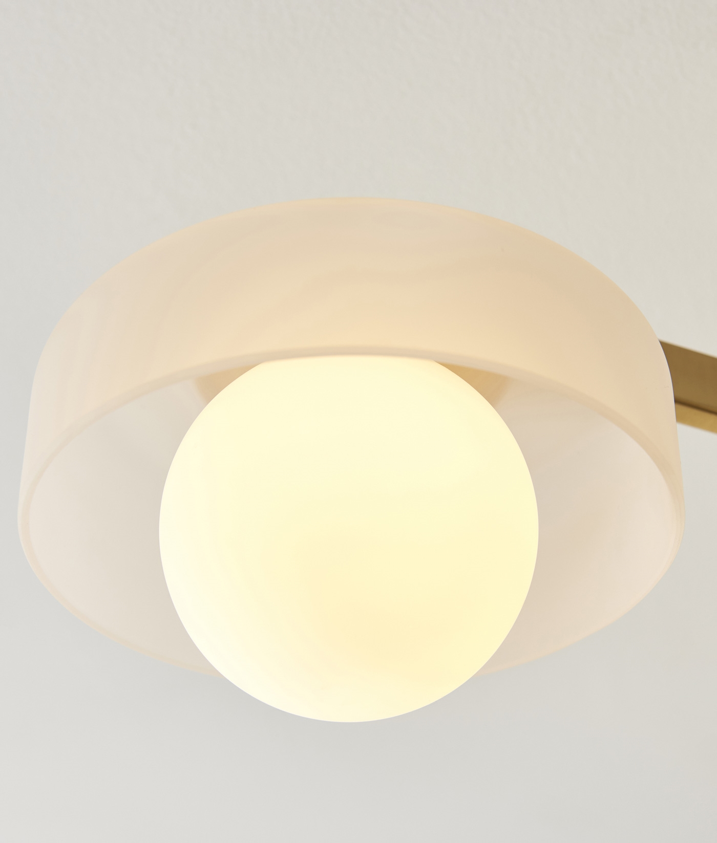 Each opal shade encloses a matt glass sphere that produces a soft, diffused light, offering a calm and evenly distributed illumination throughout the room. The warm brass finish adds a subtle touch of sophistication, making it well suited for living areas, bedrooms, or hallways.
