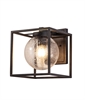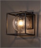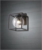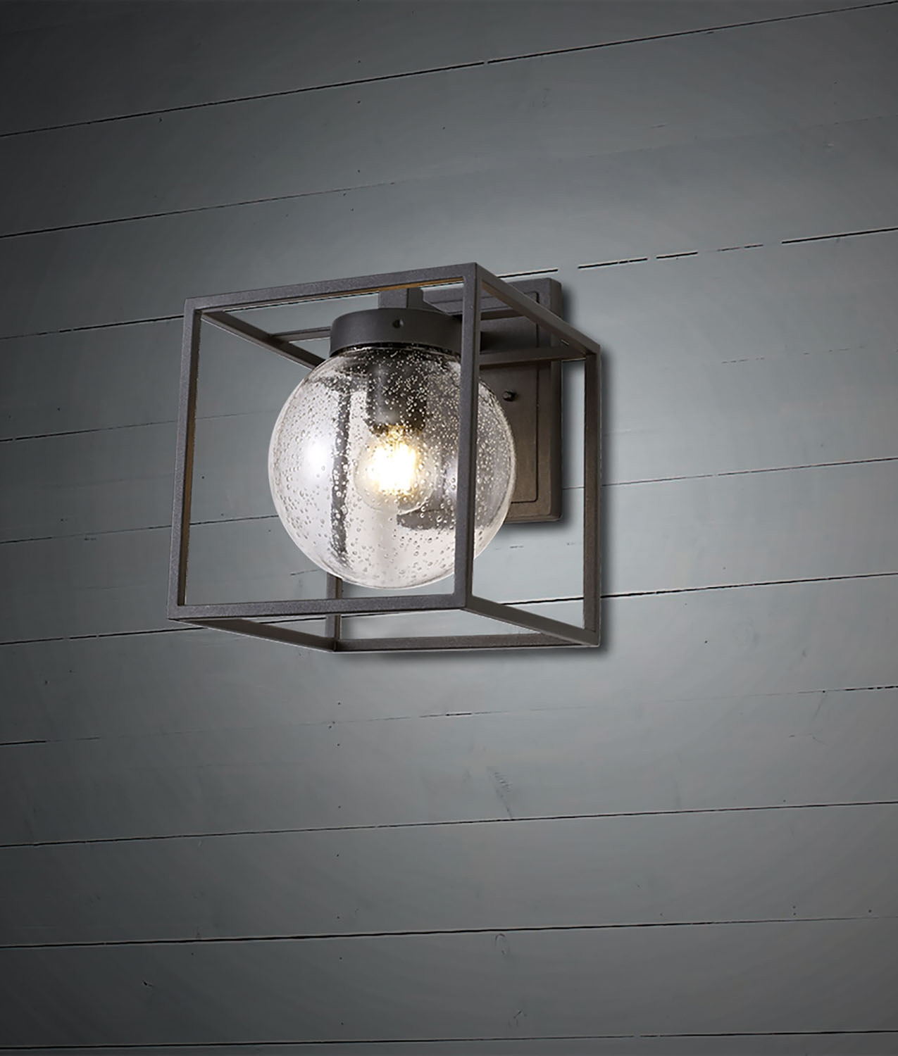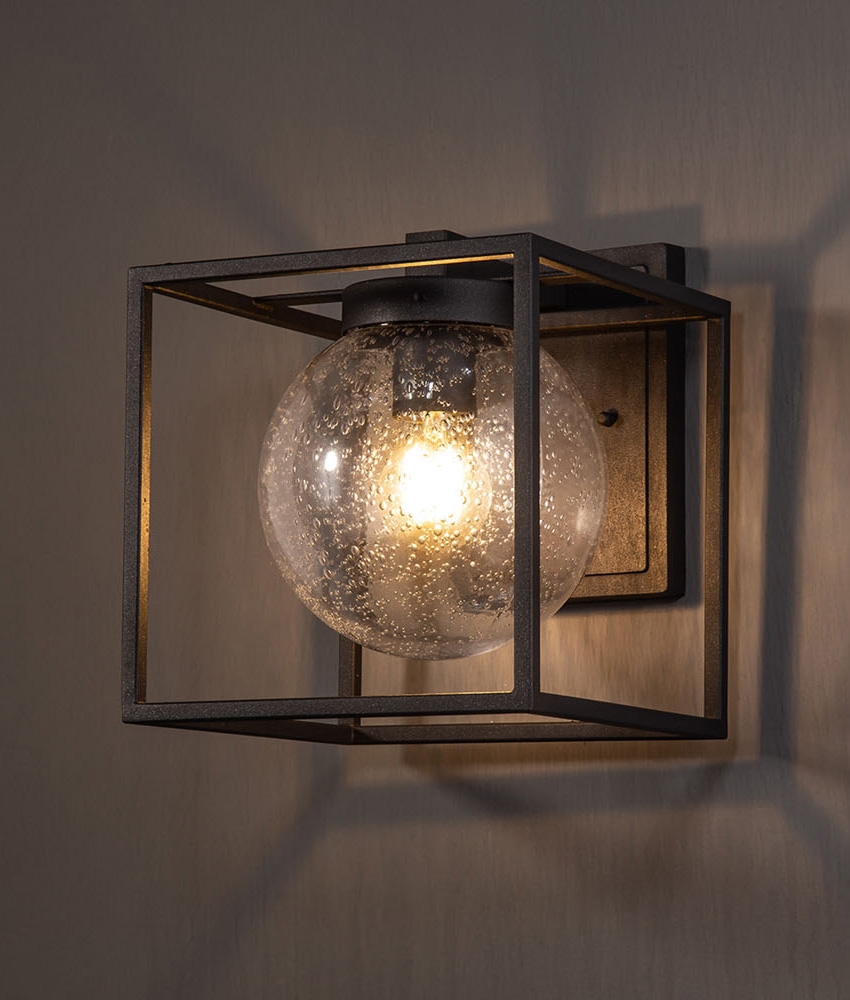 The open metal box creates a strong outline on the wall, while the seeded glass softens the light output. When illuminated, the lamp produces a diffused, outward spread of light that gently washes the surrounding wall and immediate area, reducing glare and harsh shadows. The exposed globe allows light to travel in all directions, making it well suited for entrances, pathways and terraces where practical visibility matters.