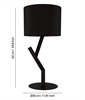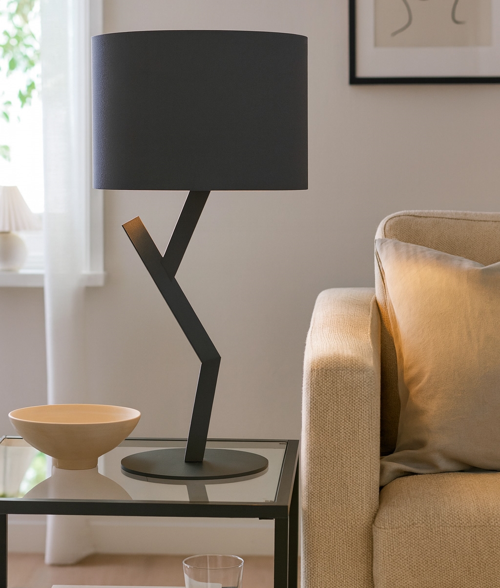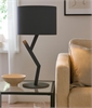 £89.00 inc VATA modern and unusual table lamp featuring a black steel base set at an angle to the shade arm. Comes complete with black textile shade which has a black interior.