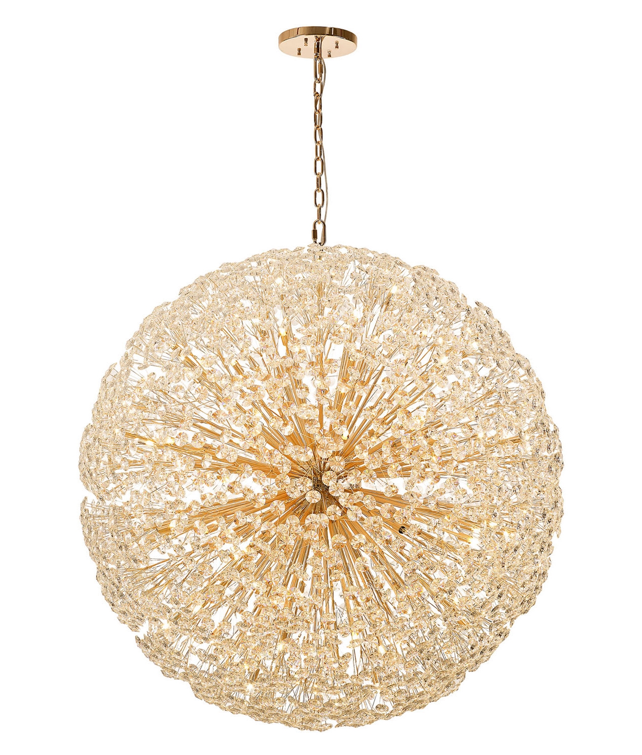 £10,440.00 inc VATThis is an exceptionally large and beautiful french gold colour finished sphere pendant measuring 1.5 metres in diameter. It has slim stems angled erratically to form an enchanting cluster of clear crystal disks. The lines of the central framework of round, tiered and oblong linear pendants, act as a base from which the crystals can sit around the G9 lamp holders ensuring the light emitted from the chosen lamp refracts through each facetted crystal throwing sublime spectrums.