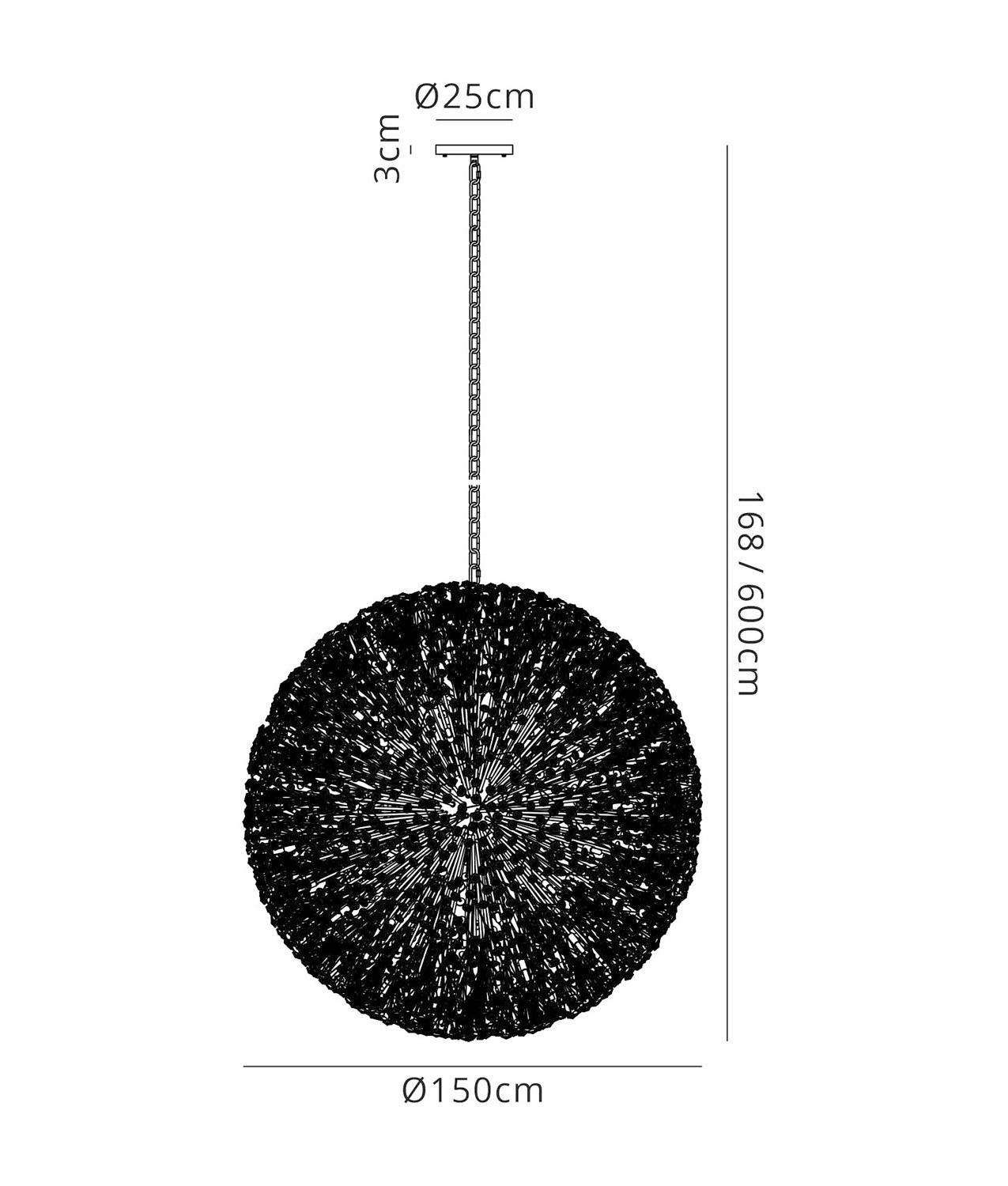 £9,480.00 inc VATThis is an exceptionally large and beautiful polished chrome finished sphere pendant measuring 1.5 metres in diameter. It has slim stems angled erratically to form an enchanting cluster of clear crystal disks. The lines of the central framework of round, tiered and oblong linear pendants, act as a base from which the crystals can sit around the G9 lamp holders ensuring the light emitted from the chosen lamp refracts through each facetted crystal throwing sublime spectrums.