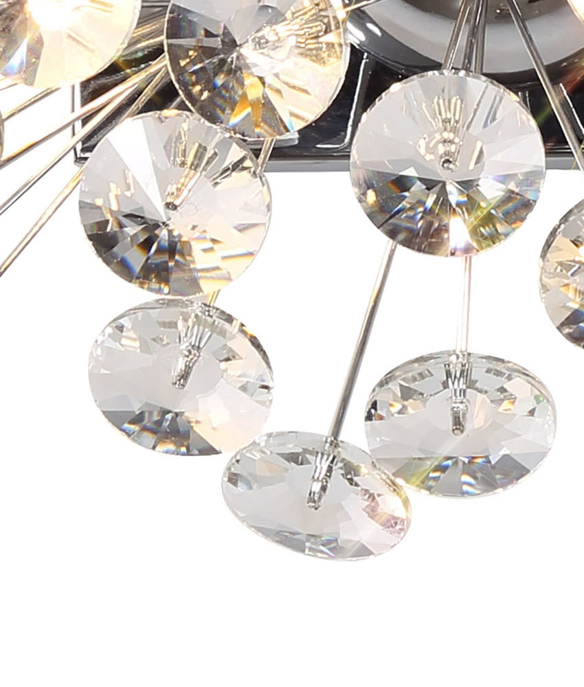 The crystal elements catch and scatter light from the internal G9 bulbs, producing a multi-directional, diffused effect. Rather than harsh spotlighting, the fitting emits a soft spread of light that enhances the room without creating glare.