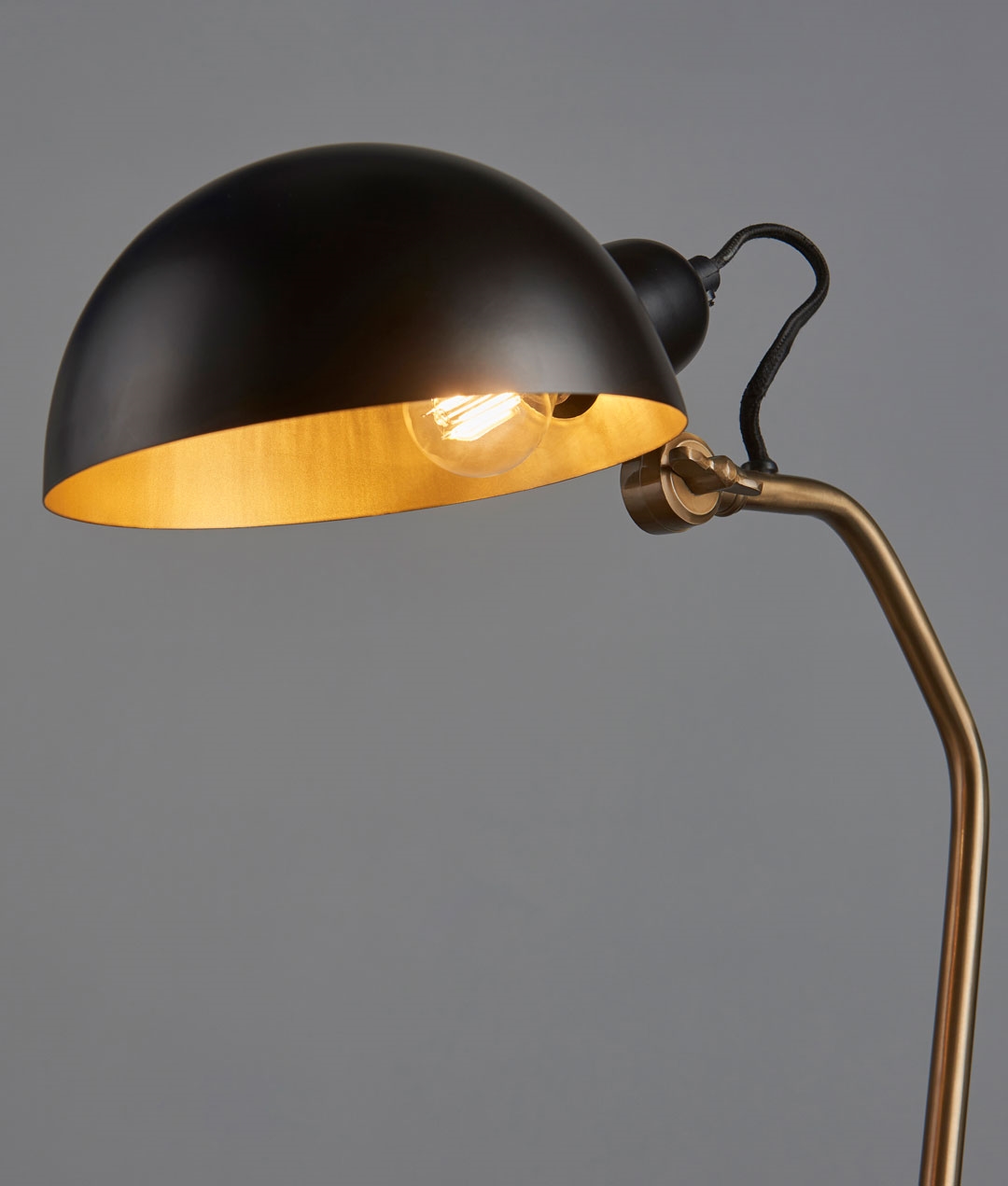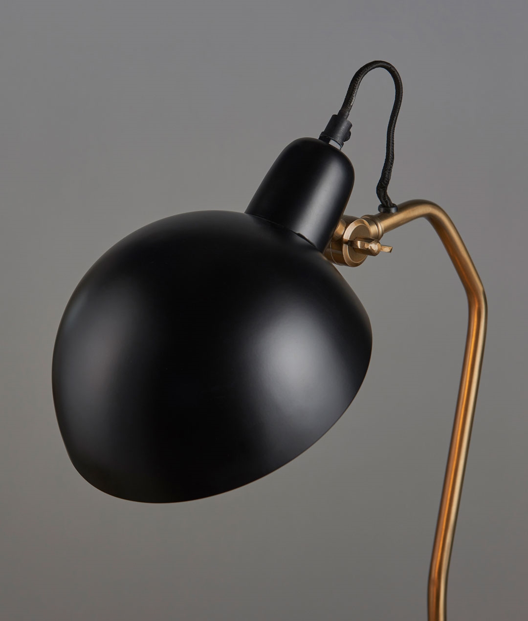 £228.00 inc VATA new take on a mid-century design brought up to date in an interesting way. Featuring an aged brass stand and black base stand with metal adjustable shade. The shade is adjusted and held in place via the turn screw on the side. This allows you to direct light where you need it and hold the shade in place.