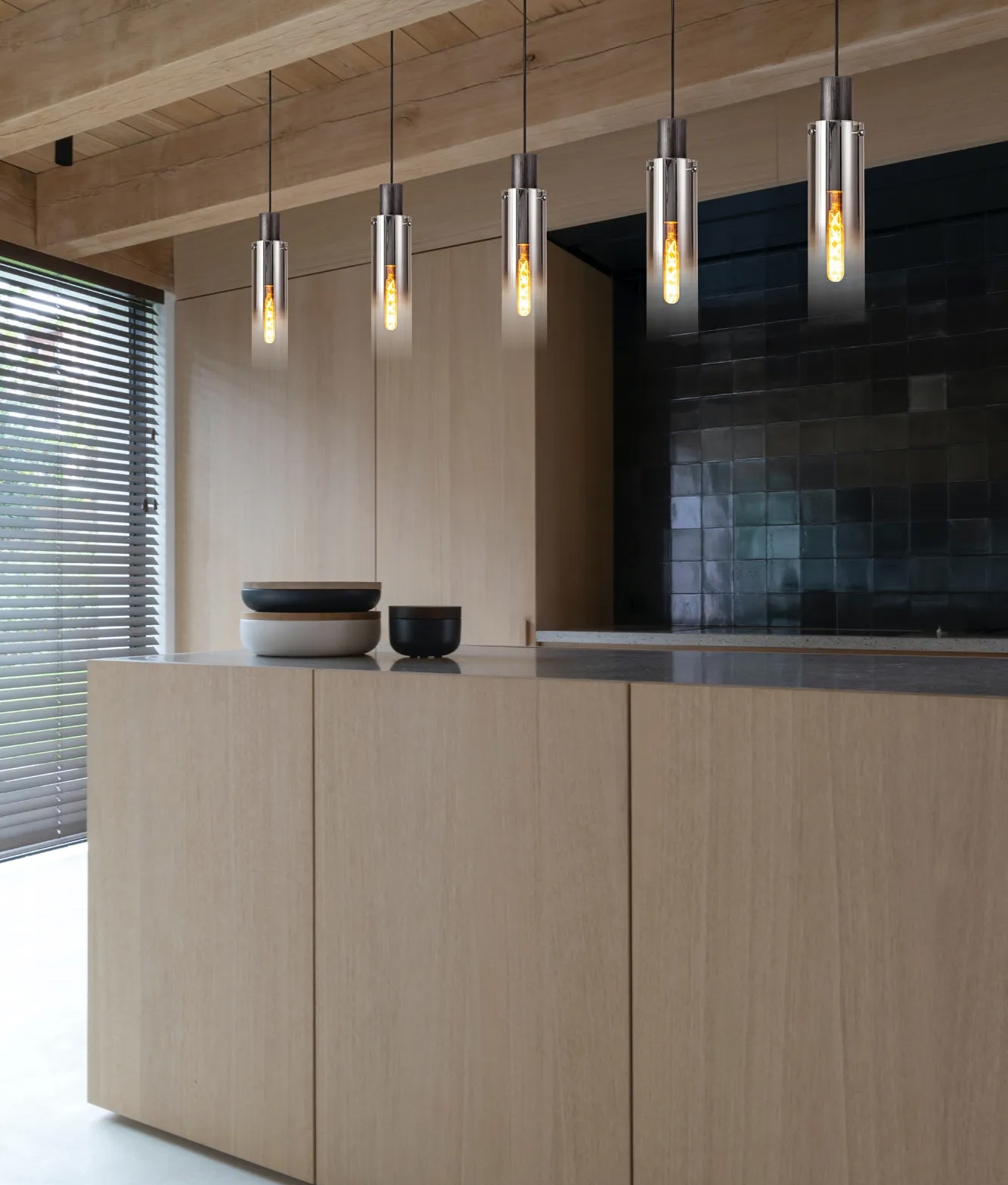 This 5 light Linear Pendant in Black-Smoke Fade Glass offers a striking blend of industrial charm and modern elegance. Featuring five substantial glass cylinders with a distinctive black to amber ombré fade, this pendant light is designed to stand out in contemporary interiors. The polished chrome details add a refined finish, making it an excellent choice for those seeking a bold, yet sophisticated light fixture.