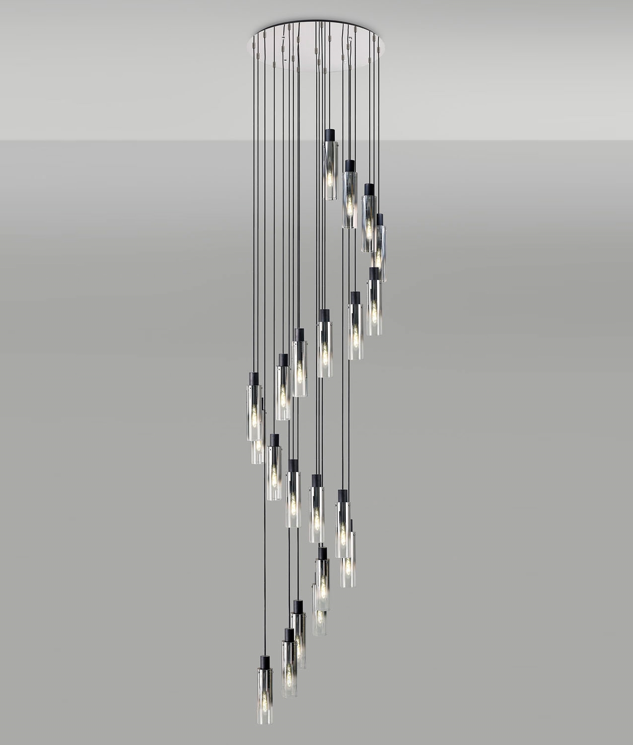 £2,100.00 inc VATThis extra large, long drop pendant is finished in chrome and has black-smoke fade glass shades. The ideal lighting solution for upscale hotel interiors. Featuring 21 glass cylinders with a unique black to amber ombré fade, this pendant creates a sophisticated visual effect that enhances large, luxurious spaces. The polished chrome detailing complements the bold design, offering a modern touch that suits high-end hotel lobbies, grand staircases, and expansive entrance halls.