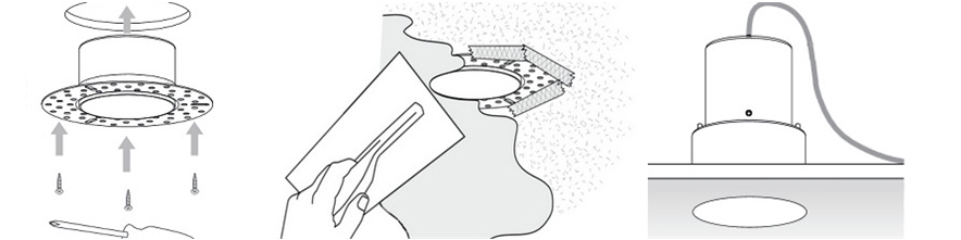 Plaster-in downlights and trimless lights are wonderful fixtures for creating a seamless design to a ceiling or wall. They have been around for a few years and if you have access to good tradesmen, i.e. a good general builder or plasterer and electrician, you can work together to provide the most discrete lighting for your space. We have broken the selection here in to two categories, one requires the ceiling to be skimmed in its entirety with 3mm finishing coat of plaster. The other options can be installed by just filling the joint between the downlight and the plasterboard ceiling.