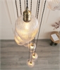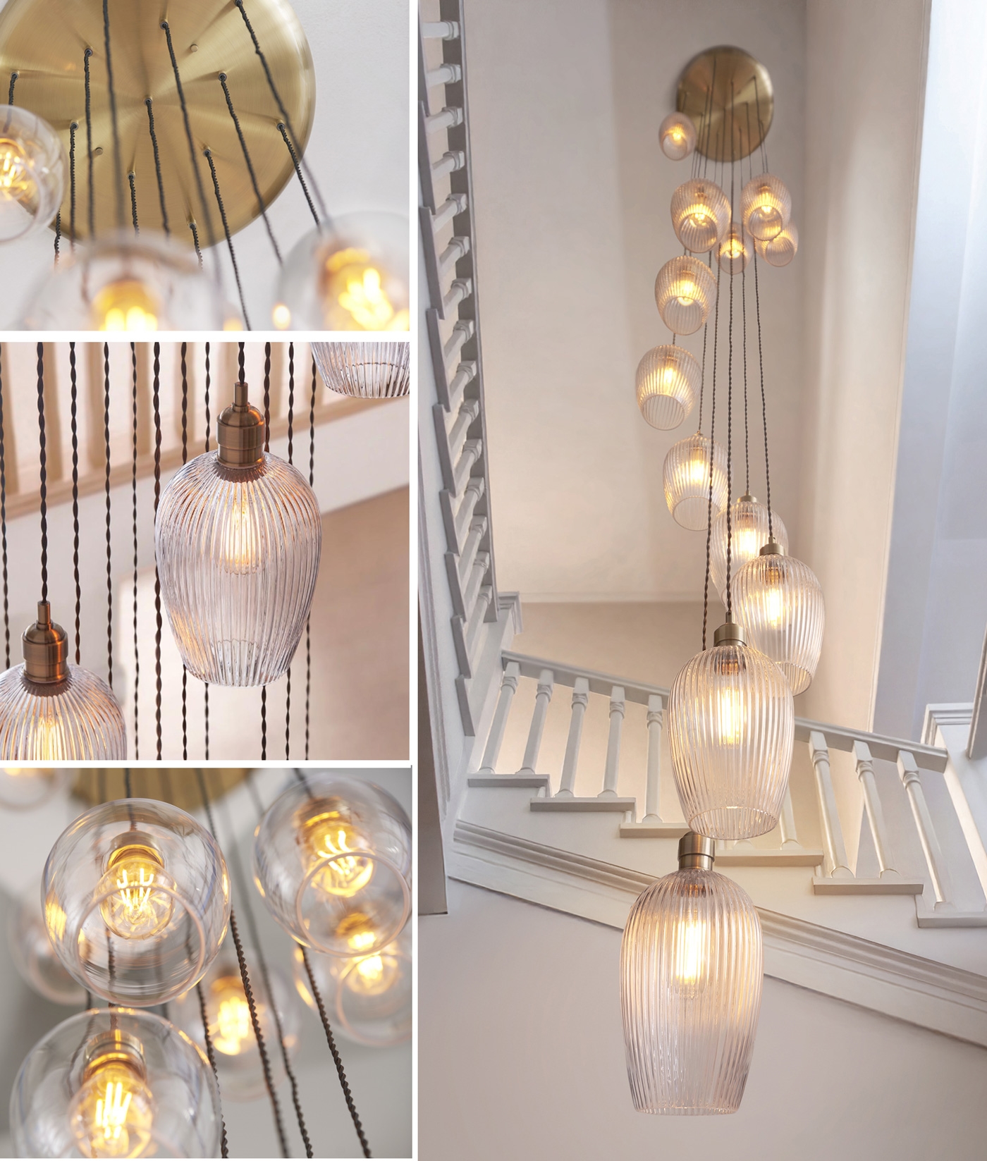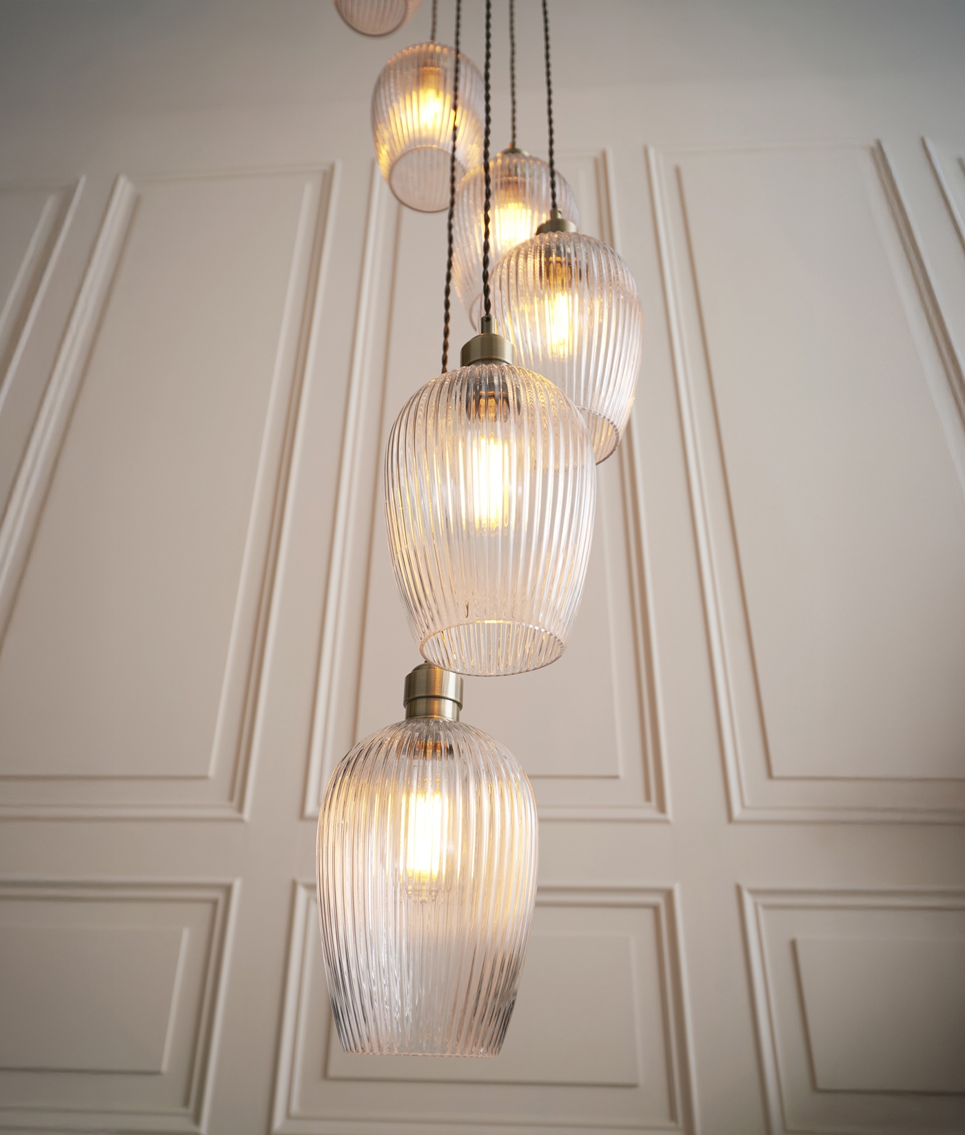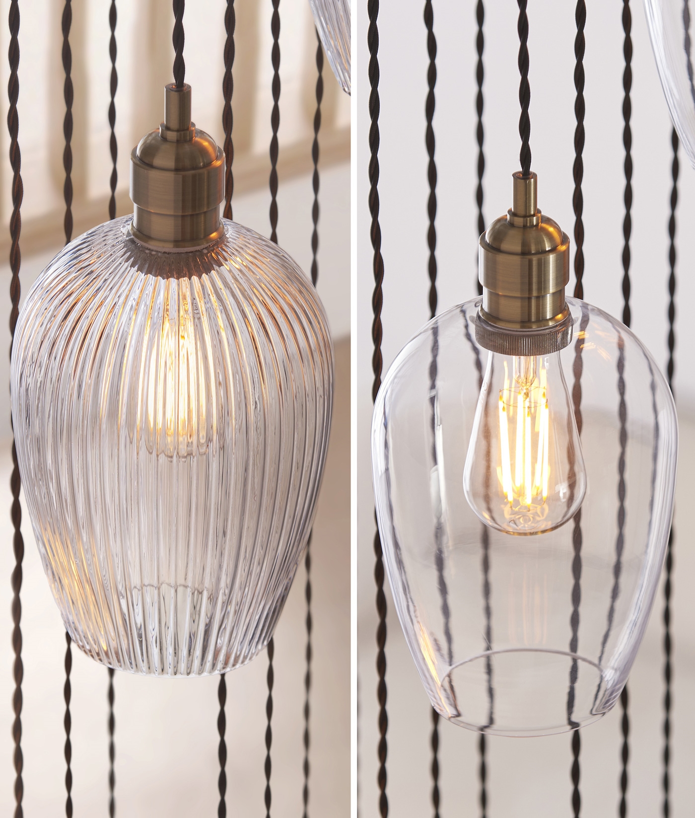 £540.90 inc VATThis striking multi-drop pendant combines sculptural design with timeless detail. Each pendant features a hand-finished glass shade, available in clear or ribbed glass, paired with antique brass fittings for a warm, classic touch.