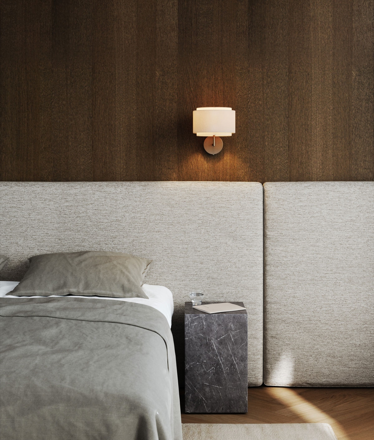 The shade is double layered and combines wonderfully with the finish of the wall bracket. The fitting will provide directional and diffused illumination. The shade measures 230mm in diameter and has matching linen diffuser to the top, so if you install bedside the lamp will be hidden from view.
