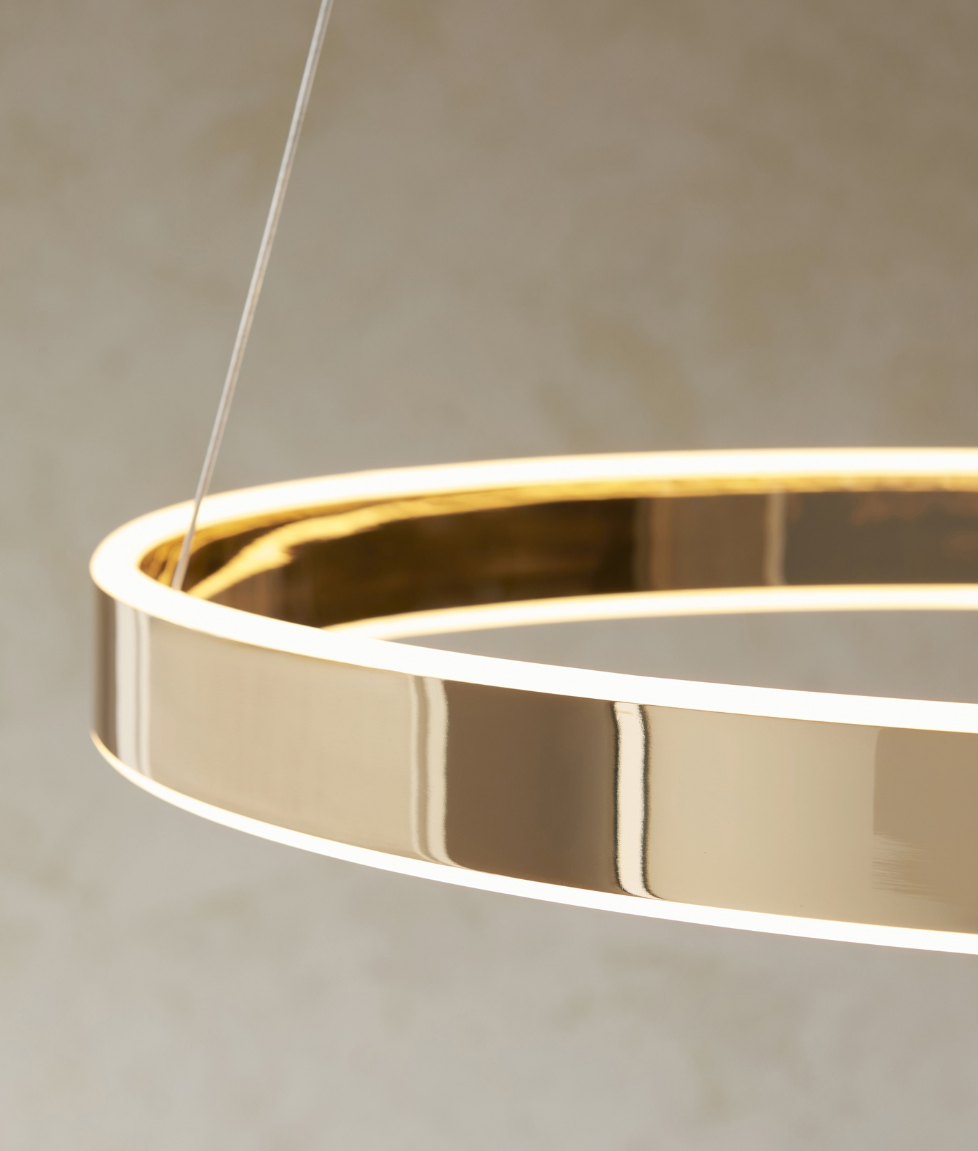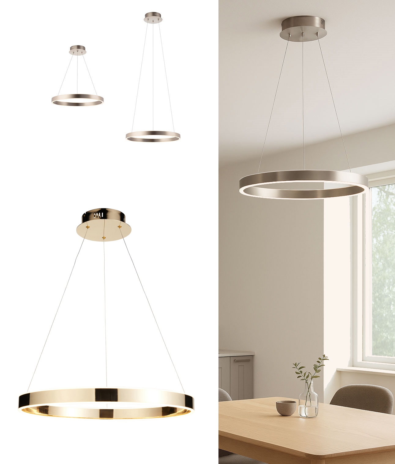 A minimalist LED pendant with architectural presence, this fitting features either a matt nickel or bright gold ring suspended on fine wire cables for a clean, contemporary finish. The frosted diffuser sits flush within the metal band, allowing soft, even light to escape both upwards and downwards. This creates a gentle, ambient glow above and a broad wash of light below, making it ideal for modern spaces where visual comfort is key.