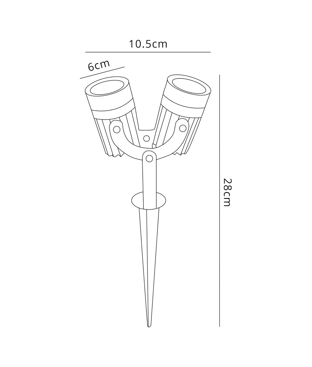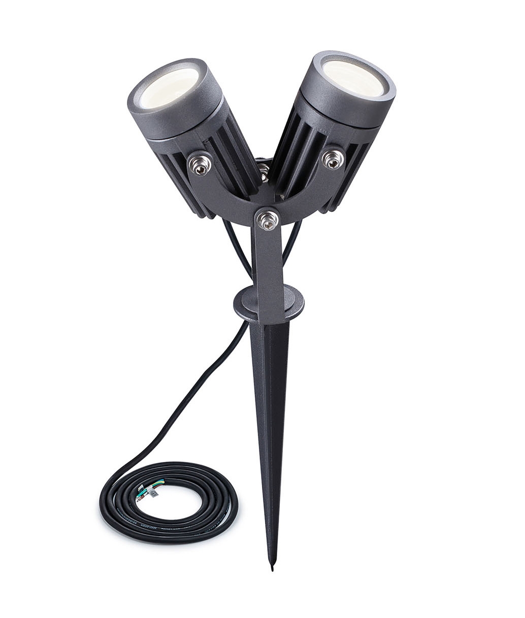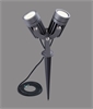 £83.00 inc VATThis is a double head spike light for exterior use. The lampheads can be angled and have integral LEDs, the light offers the freedom to angle the illumination to highlight a particular area or even use the beams of lights to create a feature of their own. Spikes can also be removed and the spotlight fixed directly to walls or ground for complete versatility.