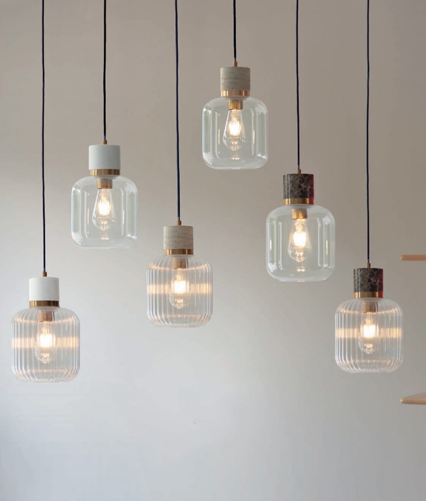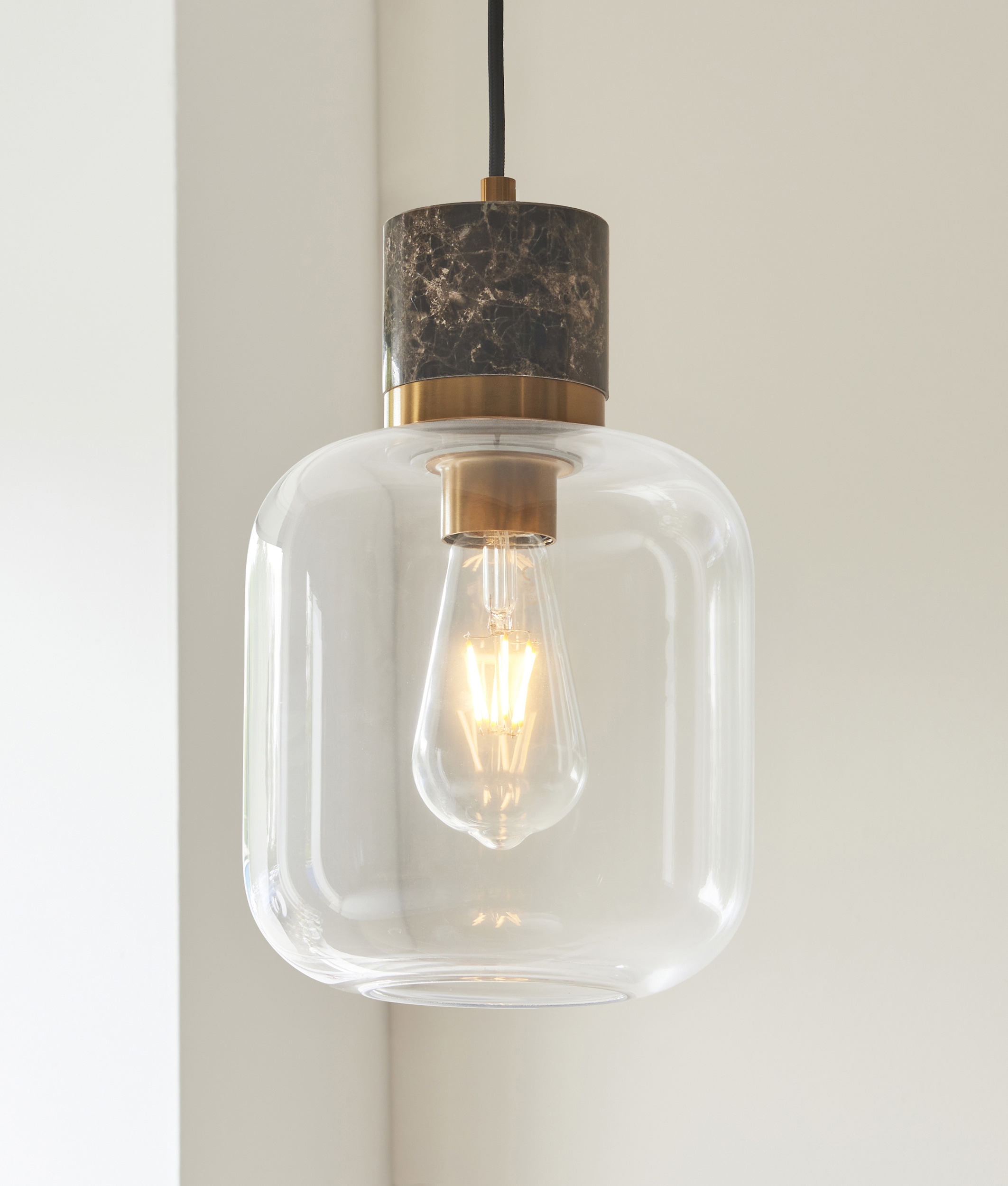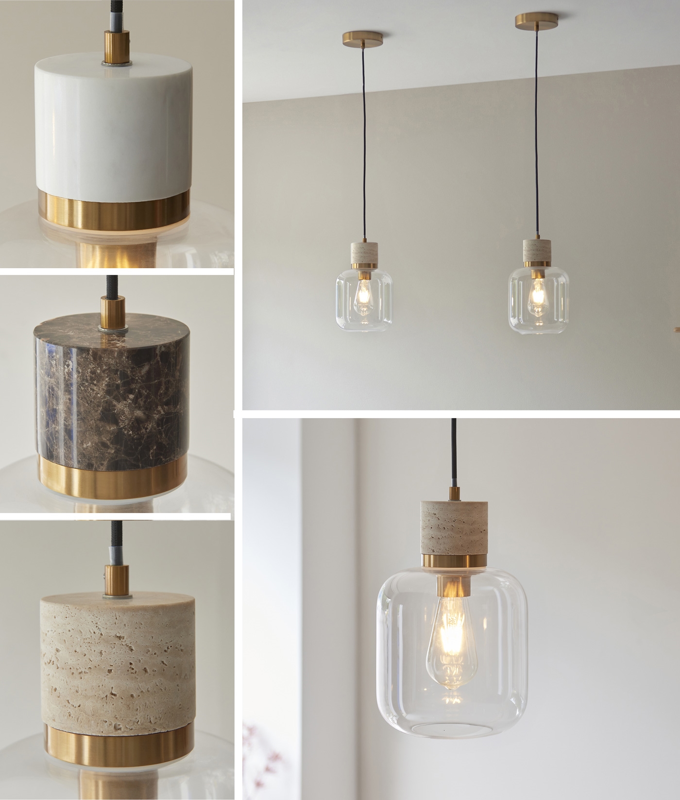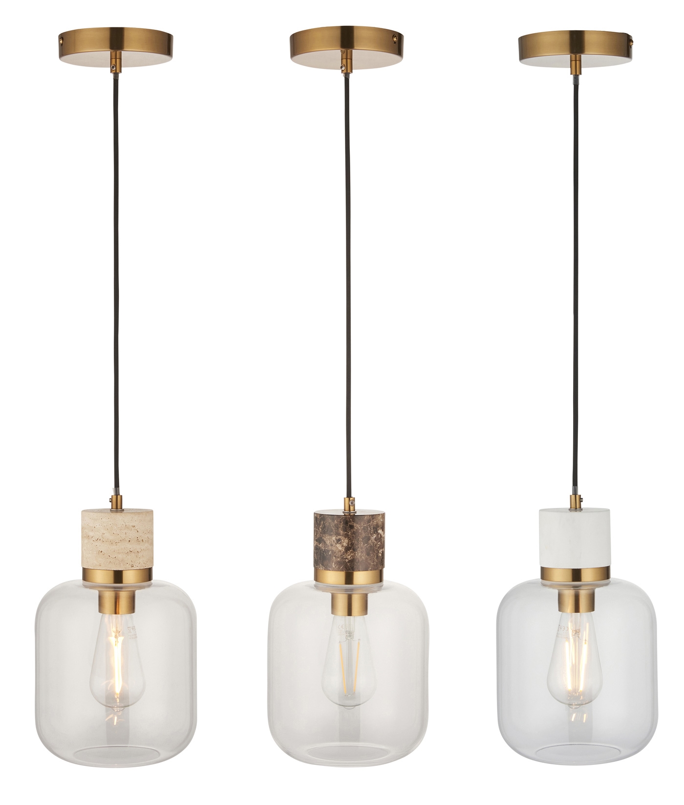 £127.00 inc VATThis single clear glass pendant light combines refined materials with a minimalist design. Measuring 185mm in diameter, it features a brass ceiling rose and lampholder complemented by a choice of marble tops in white, natural, or dark brown. Each finish adds a distinctive character while maintaining a balanced and elegant look.