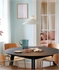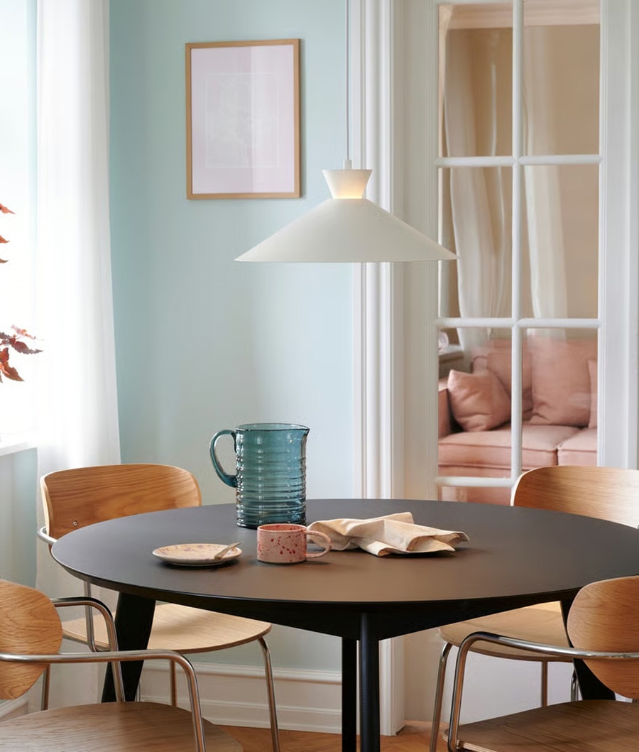 The shade directs clear downward light, ideal for task or dining areas, while a subtle opening at the top lets a soft, diffused glow escape upwards, adding depth and balance to the room’s lighting.