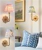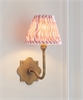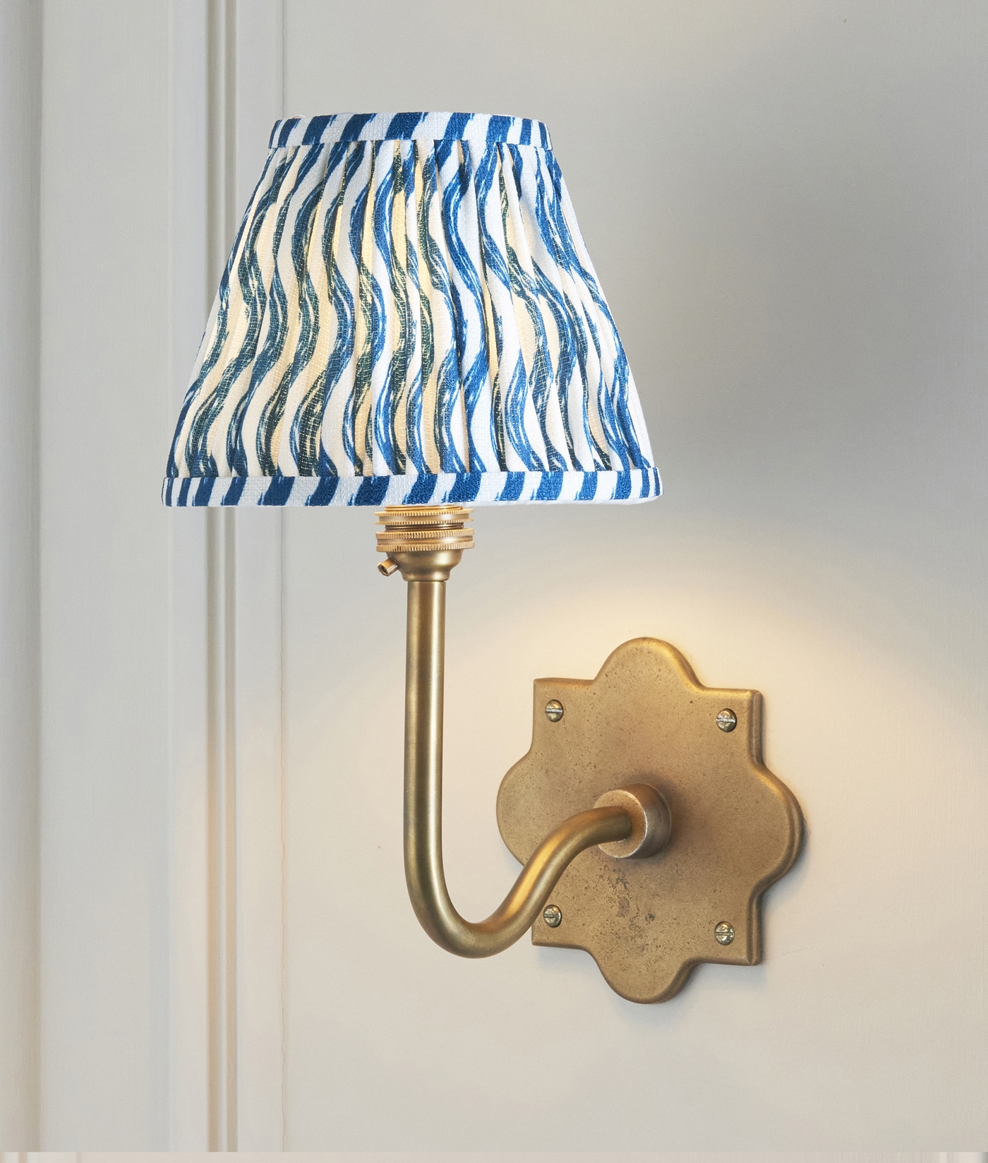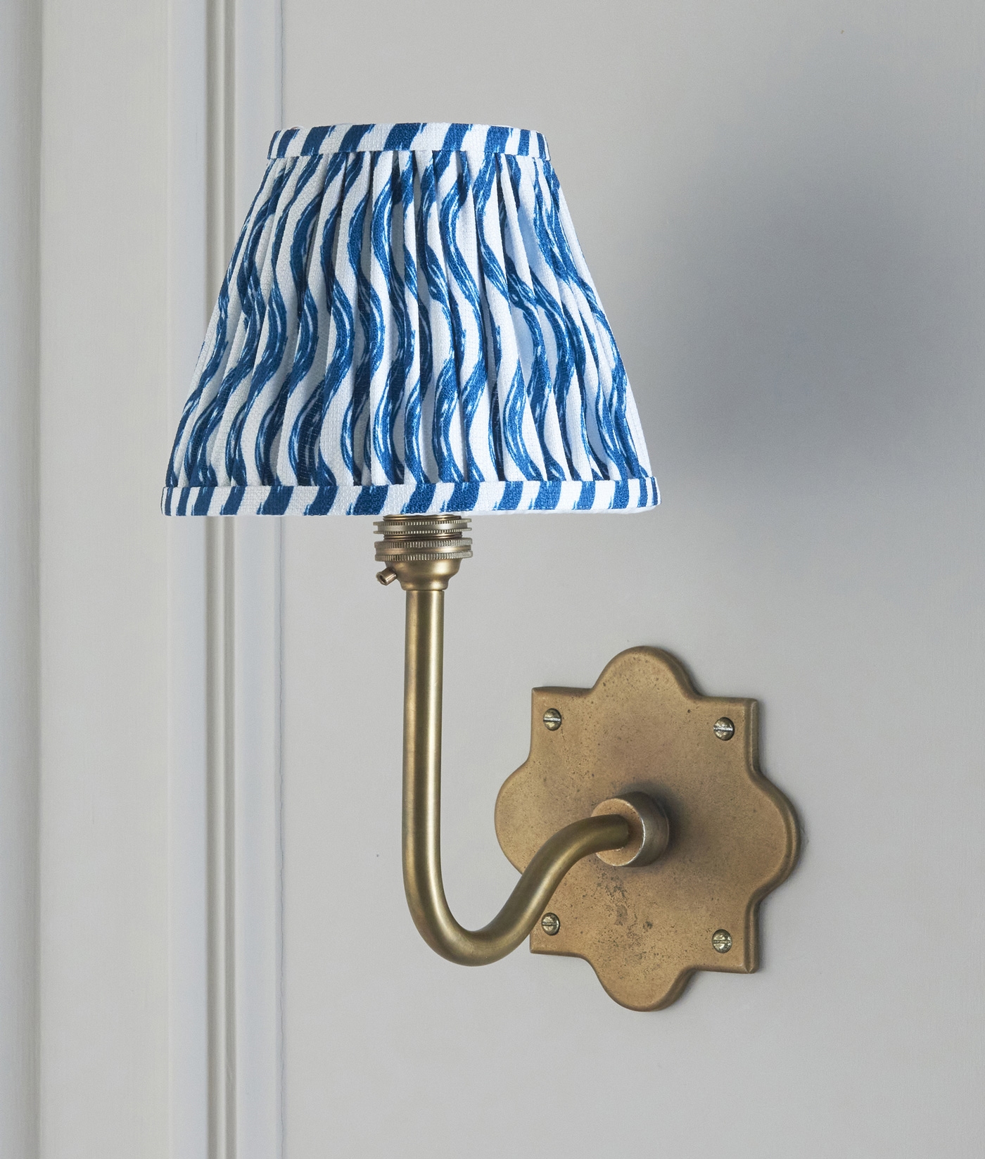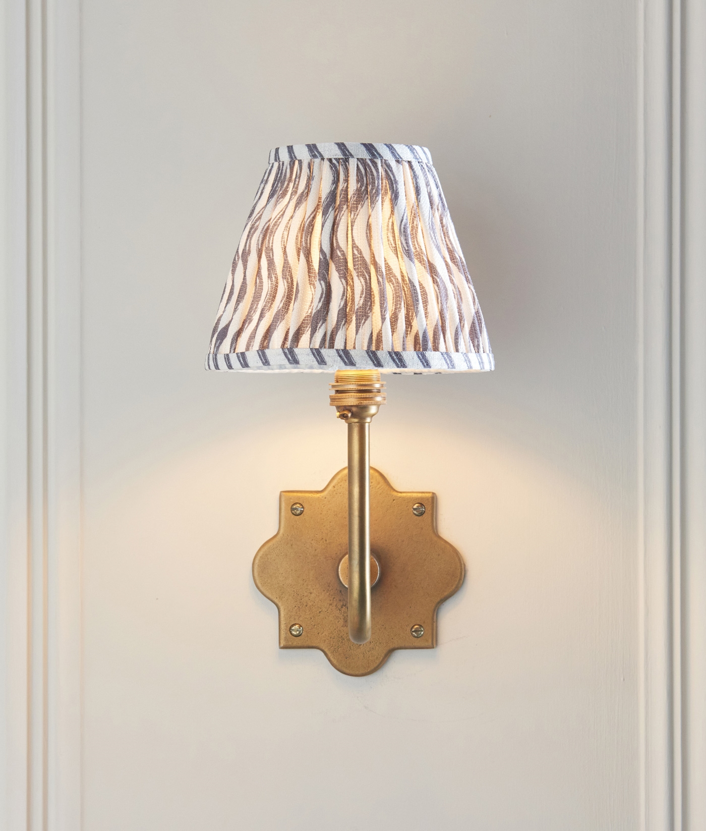 £90.90 inc VATBring refined character to your interior with this single arm, B22 wall light designed with a hand-cast brass backplate in a soft quatrefoil form. The curved arm in a natural brass patina complements a pleated fabric shade, available in three distinctive designs to suit both classic and contemporary settings.