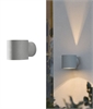 £44.08 inc VATThis cylindrical exterior grey wall light has an open top and bottom and contains a single mains halogen lamp. The top has a laser cut profile to create a narrow fan effect on the upward light.