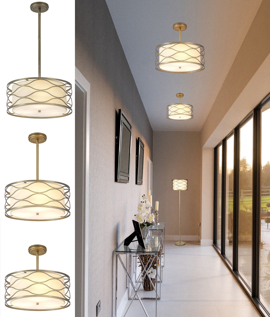 Aged Gold & Cream Drum Shade Pendant - Convertible to Semi-Flush