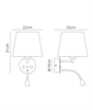 There is a USB socket on the round wall plate which will allow you to charge a device such as an electronic reader, smartphone or tablet. Available in three finishes, white, satin nickel or antique brass all including a cream fabric shade. The shade measures 220mm wide. The round back plate, measures 100mm in diameter.