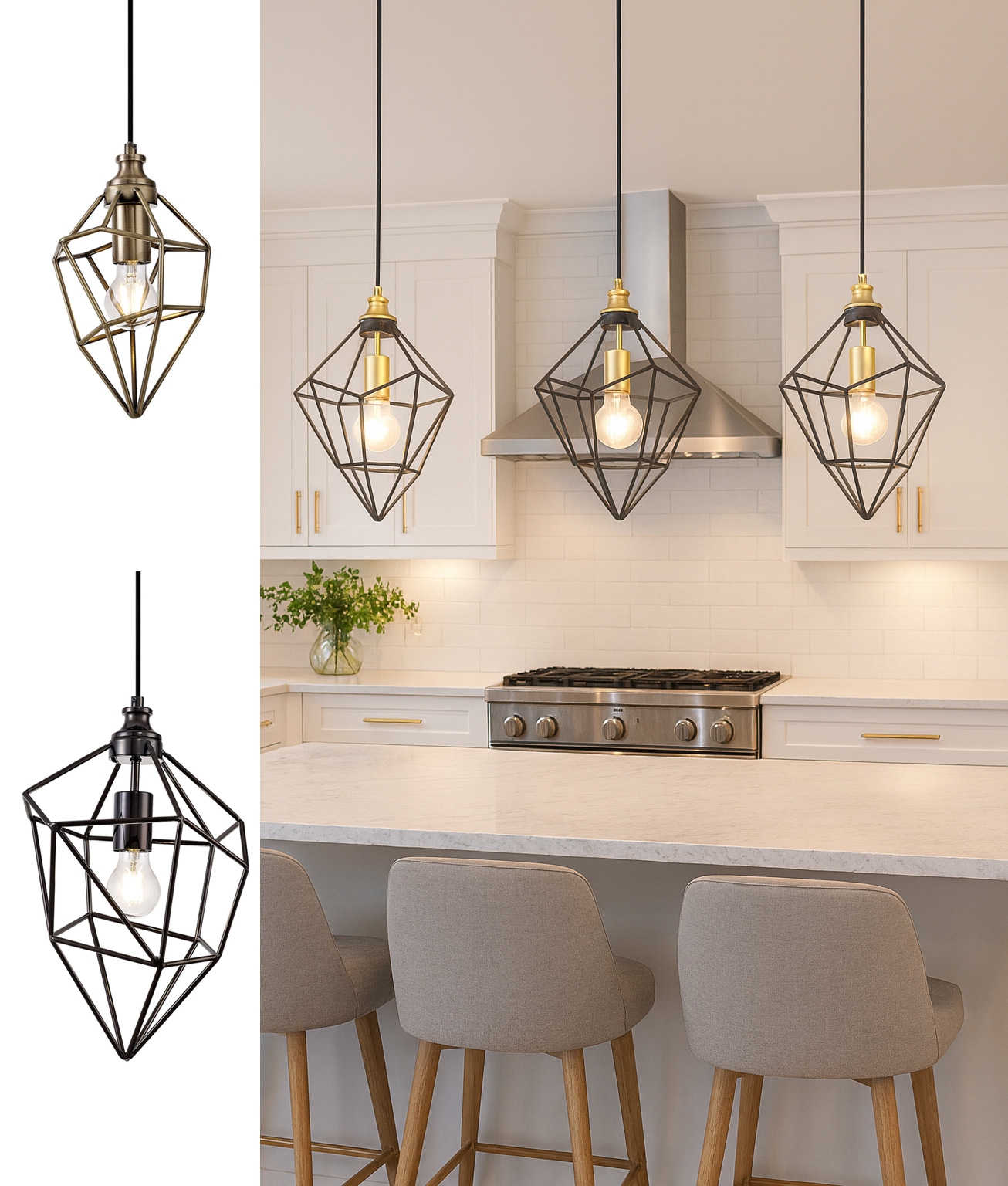 Each design focuses on everyday usability. The exposed bulb sits at the centre of the frame, ensuring strong task lighting over worktops or islands, while the angular shape adds shape and definition without overwhelming the room.
