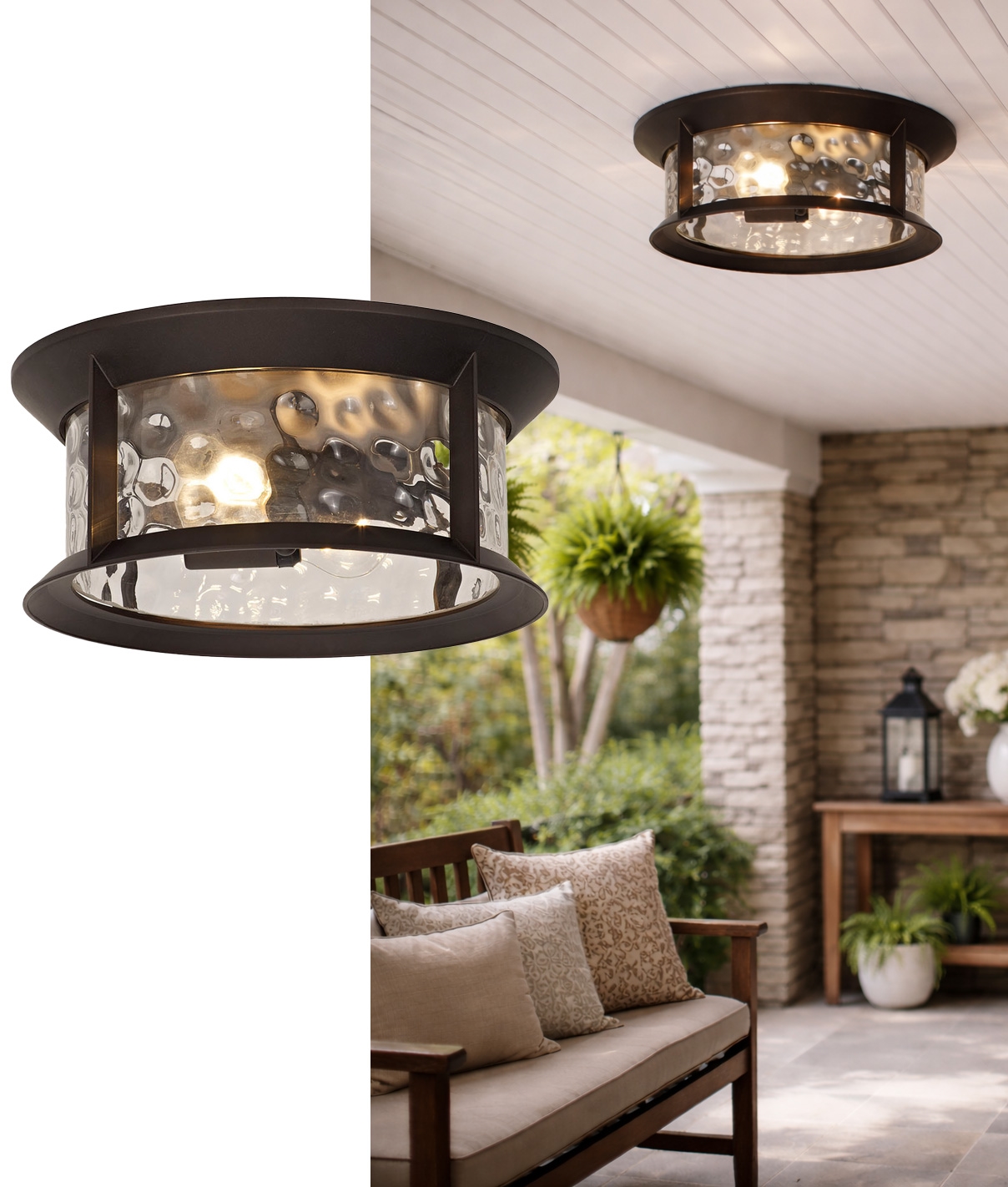 In use, it provides clear, practical illumination for entrances and seating areas without overpowering the setting. The enclosed design also helps protect the lamp from moisture and debris, making it a dependable choice for sheltered outdoor ceilings.