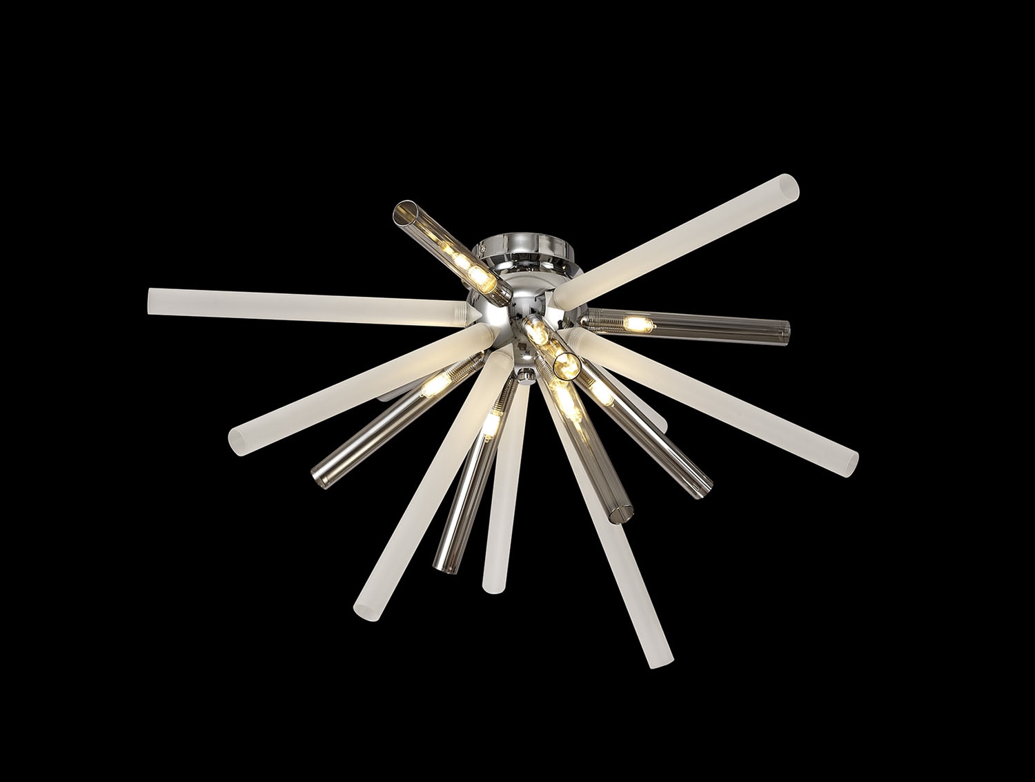 £154.00 inc VATFelipe has an abundance of narrow glass tubes in various sizes which are cleverly arranged into a sputnik composition, devising a larger three dimensional effect around the polished chrome central orb frame. This statement design is applied to both a sixteen light pendant and an eight light semi-flush ceiling fixture, with each G9 lamp holder situated within the glass tubes. In order to supply an option for multiple colour schemes each polished chrome item is available with either amber/champagne, chrome/clear or smoked frosted glass pieces.