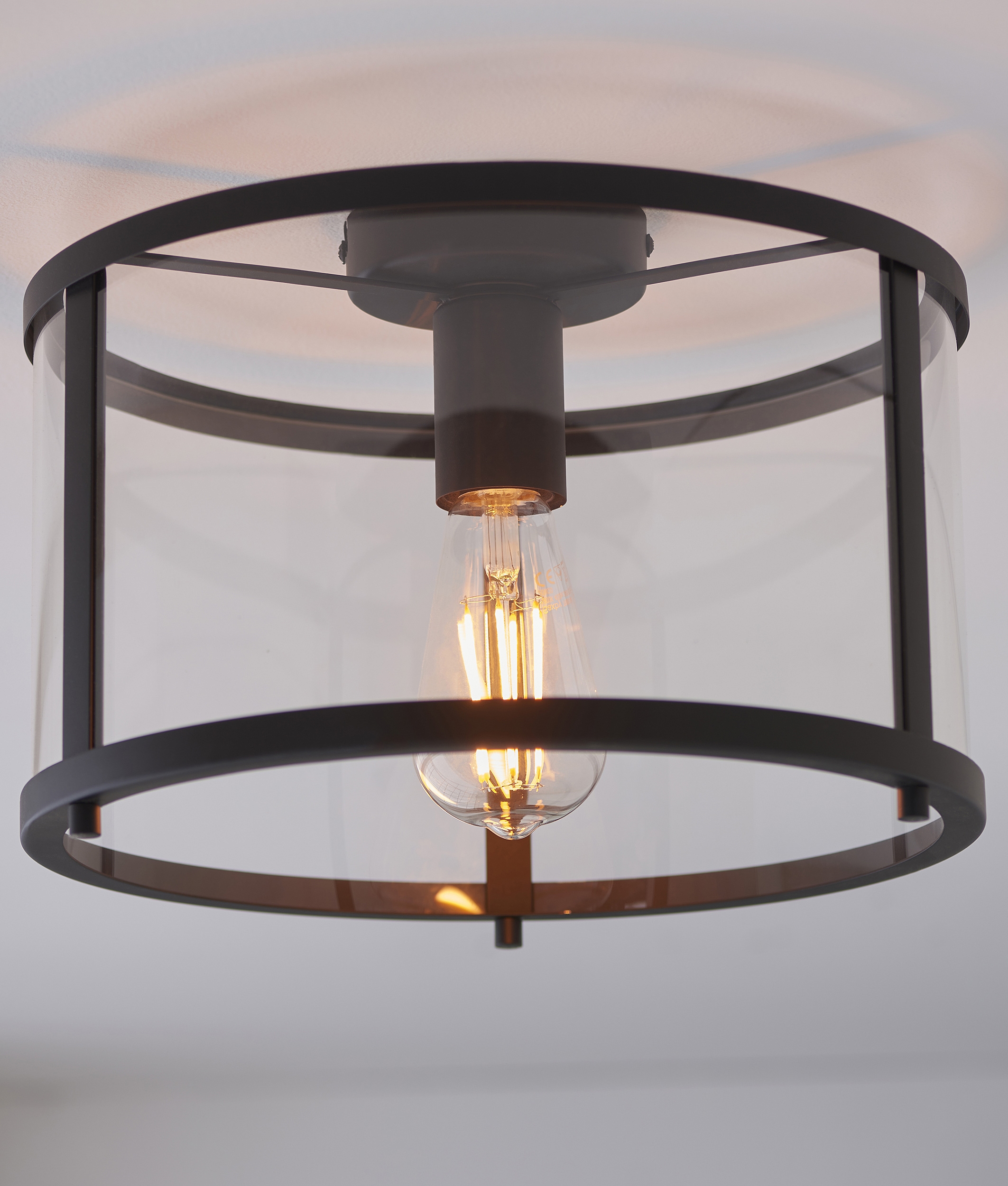 From £136.00 inc VATThis ceiling light marries the charm of a traditional lantern with the clean lines of modern design, making it an ideal solution for both contemporary and period homes that have lower ceilings. The flush fitting design ensures that it does not intrude into the living space, while the clear glass shade showcases the bulb within, offering an opportunity to personalize the look with a choice of filament lamps.
