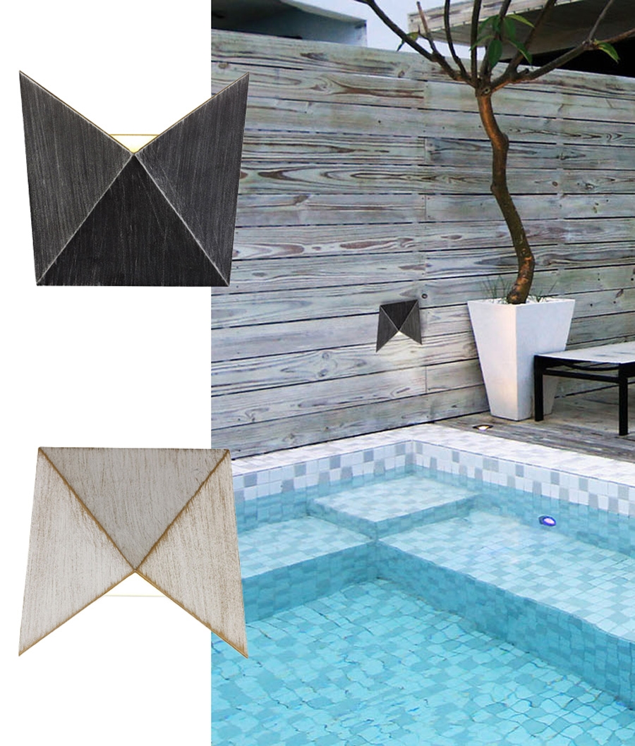£59.00 inc VATThis wall light has unusual style with a triangular shape which envelopes the intregral LEDs into a 45 degree projection. Available in either black and silver and white and gold finish it is stylish for many outdoor spaces and can be installed with the light projecting upwards or downards.