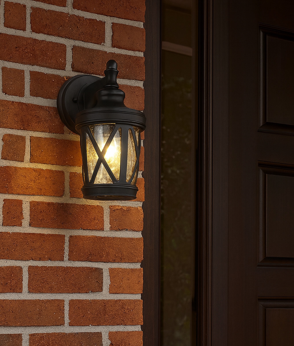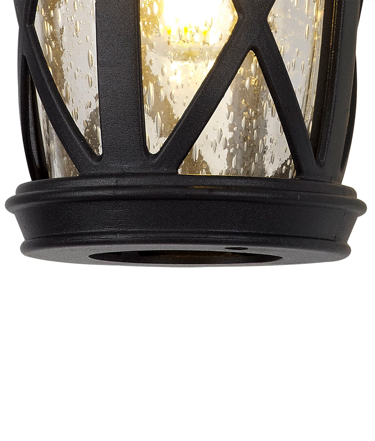 This hanging lantern in sand black with a round shade featuring criss-cross pattern is partnered with a clear seeded effect glass which gives the illusion of raindrops within the glass. Great for installing next to front doors or around a property to provide illumination and improve visibility.