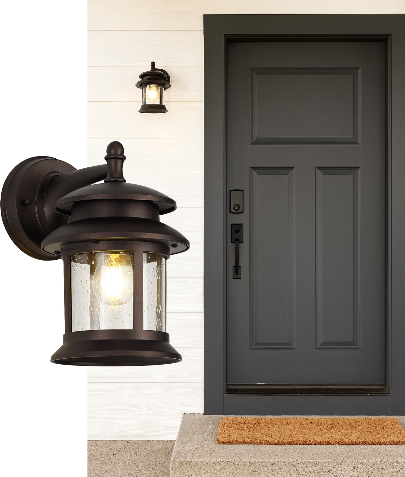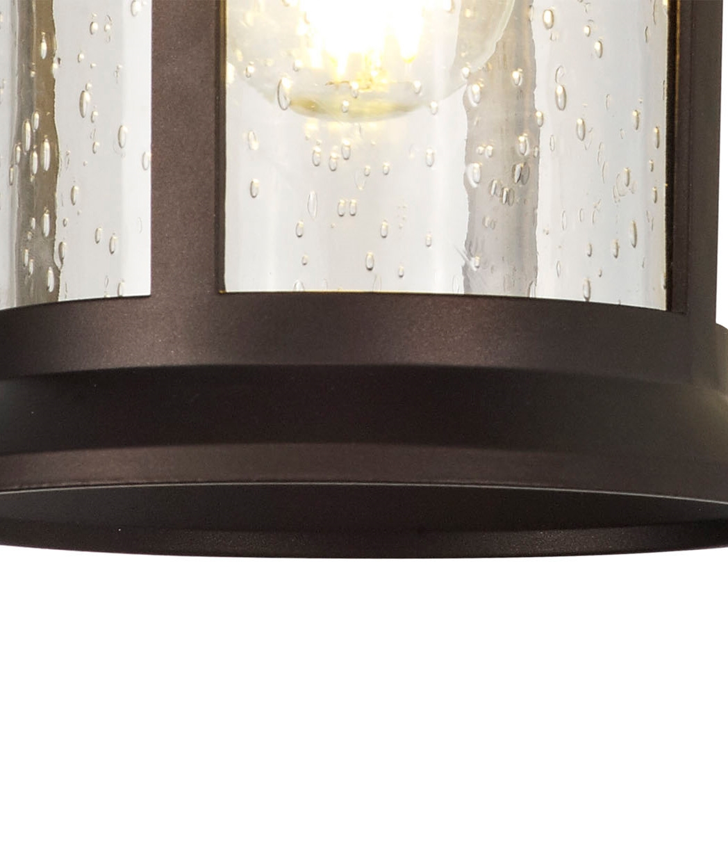 This hanging lantern in antique bronze with a round seeded glass shade features is ideal installing next to front doors or around a property to provide illumination and improve visibility.
