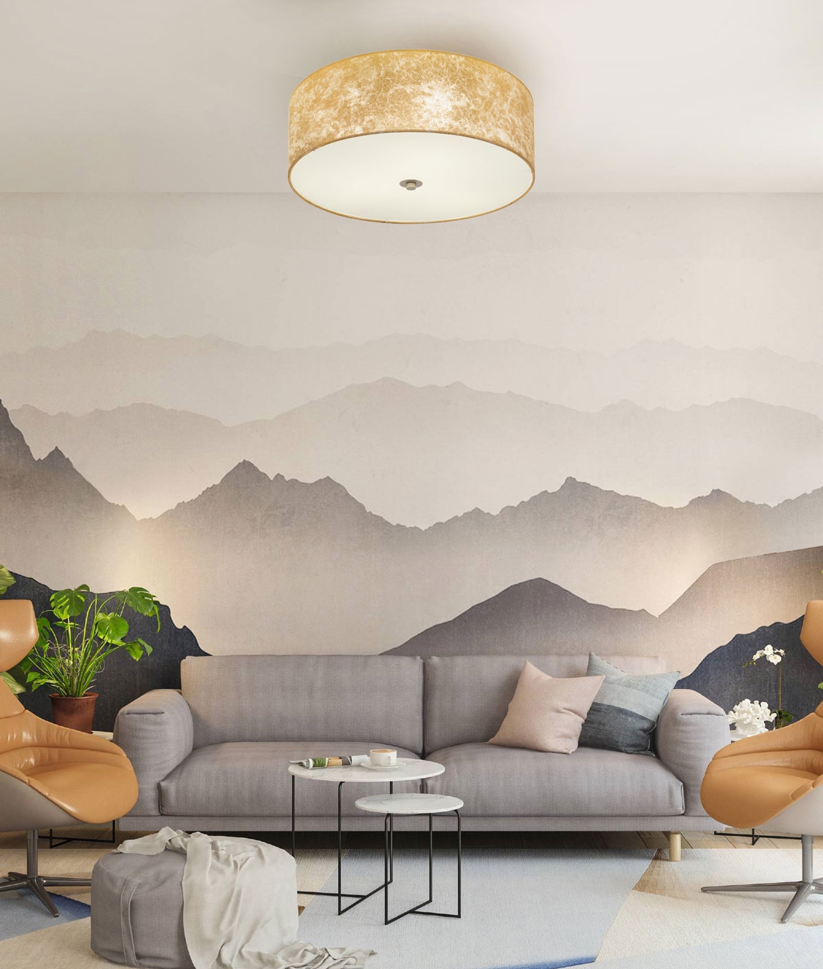 £146.00 inc VATThis round ceiling light is a fabric lampshade with a gold leaf-style with a gold coloured metal finish. Underneath held in place but a bolt detail is a white diffuser which allows for glare-free lighting.