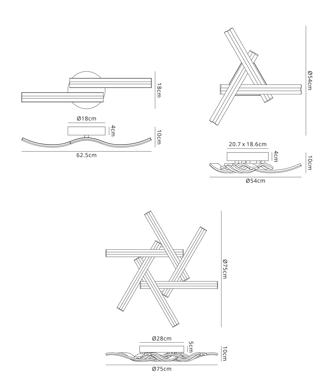 Choose the two-light ceiling fixture or wall lamp for a clean, understated linear look. For greater visual presence, the three, and six-light designs overlap gracefully to create soft, circular movement, with the six-light model offering a practical three-step dimming function for adjustable brightness.