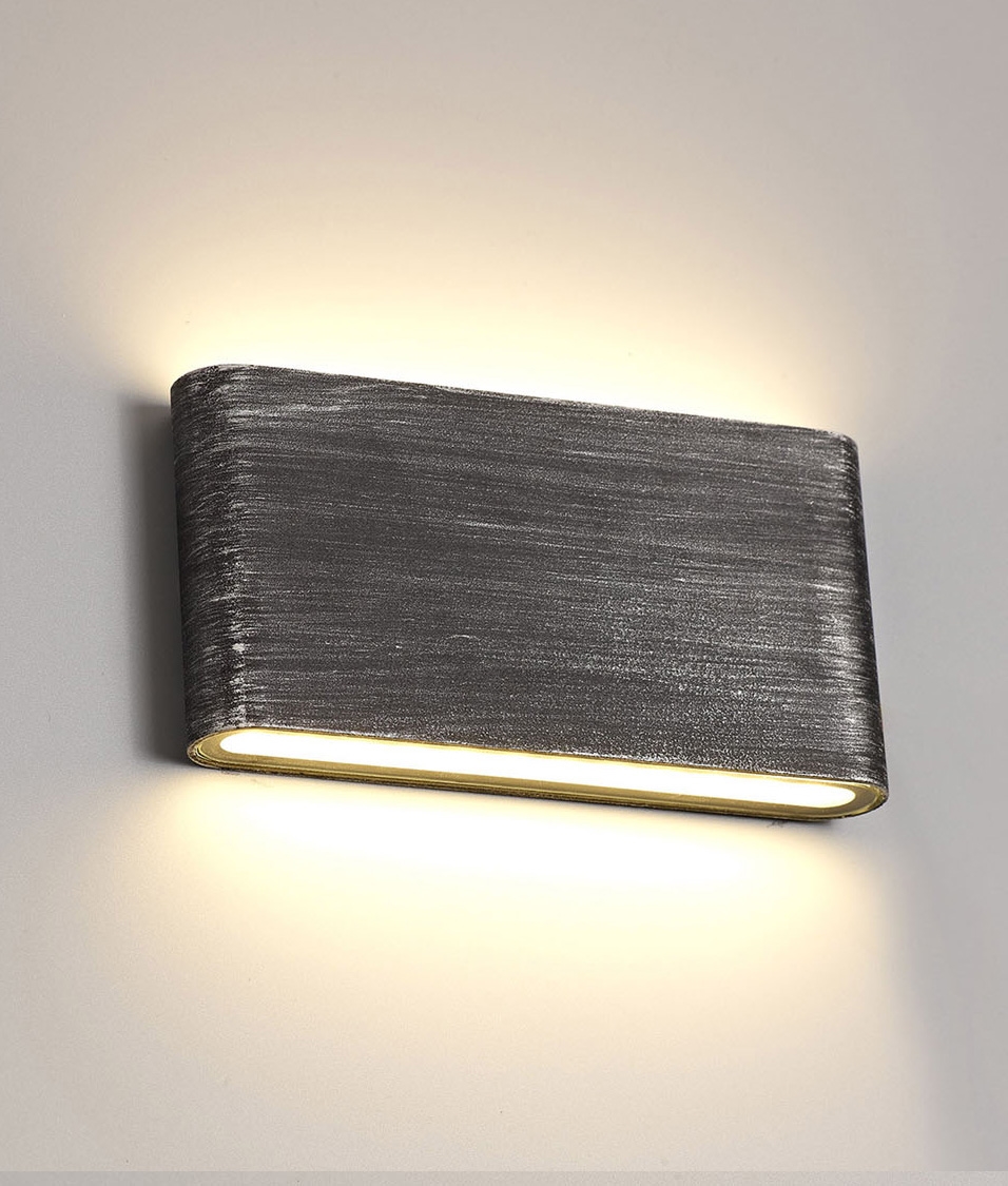 £55.00 inc VATThis wide wall light brings together a weathered, hand-finished look with contemporary LED performance. The brushed black and silver exterior resembles aged metalwork, while the integrated LEDs deliver a steady, diffused up and down wash of light that suits both indoor and sheltered outdoor areas.