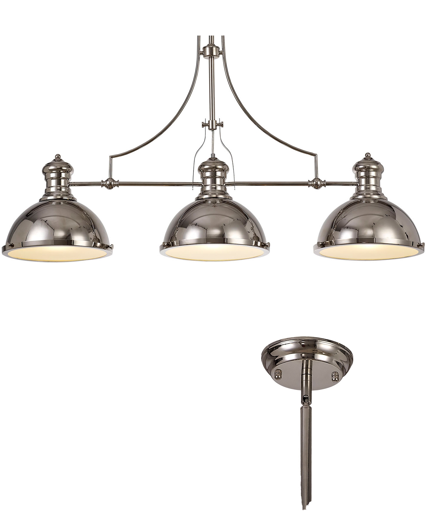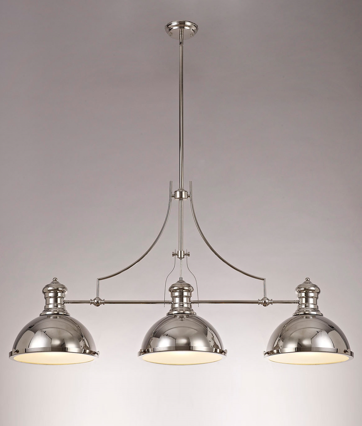 £505.00 inc VATThis three-light pendant is designed with a classic polished nickel finish and dome-shaped shades that direct light downwards. Positioned above a kitchen island, it provides strong, focused illumination, ideal for food preparation and dining.