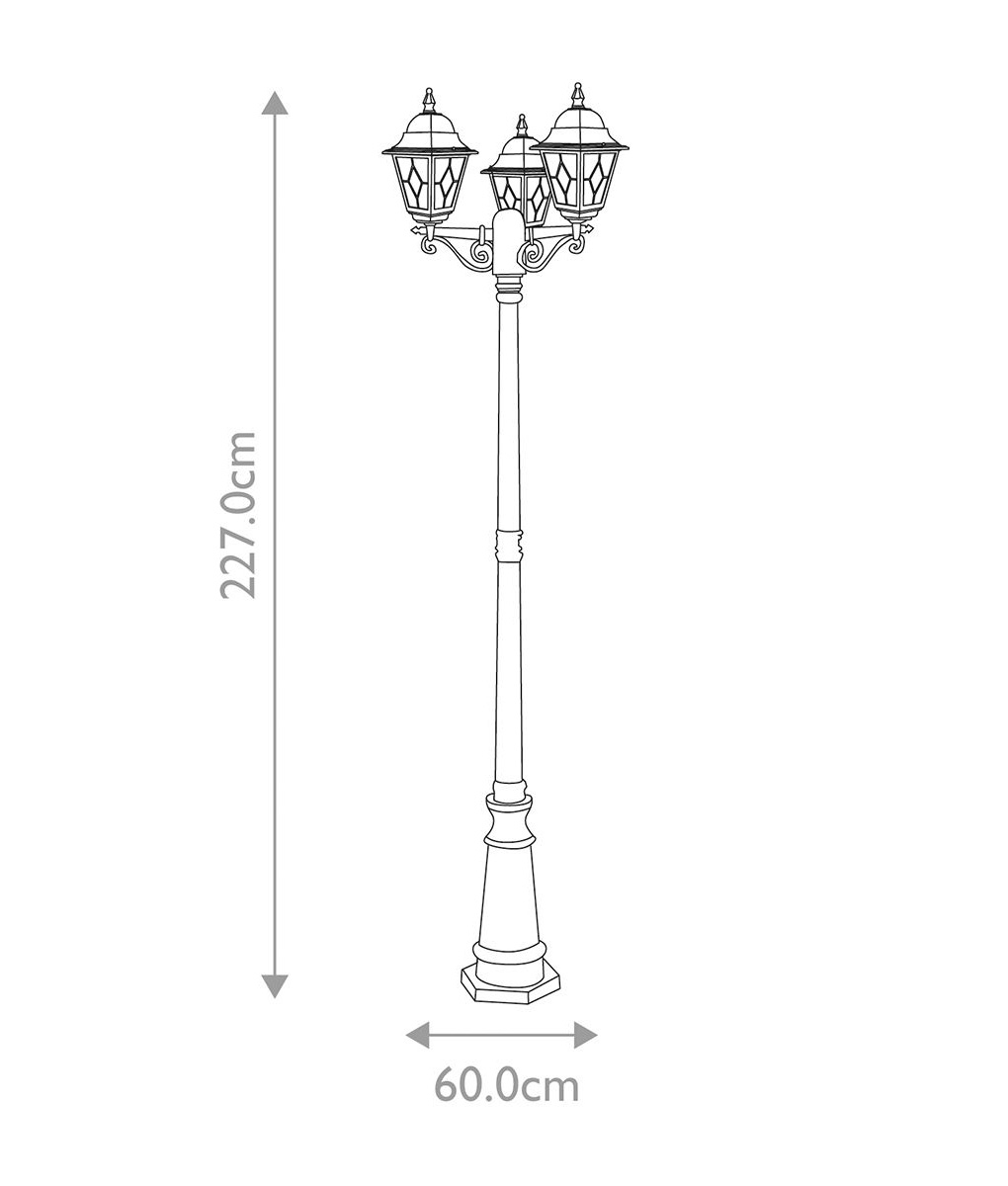 £370.00 inc VATThis traditional exterior lamppost has three lantern heads that provide clear general lighting across garden paths, drives, or patio areas. With a potential combined output of 180 watts, it spreads light evenly in multiple directions for improved visibility after dark.