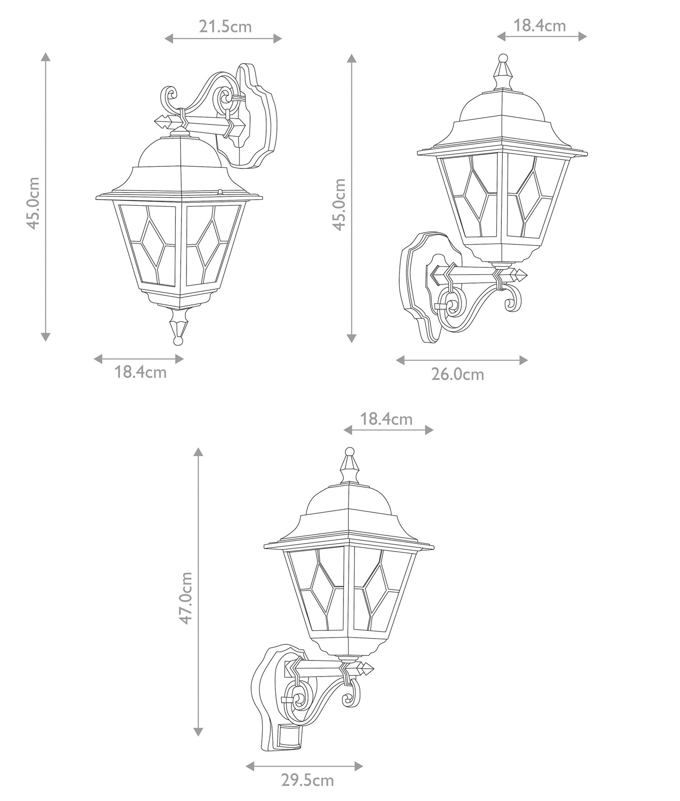 From £75.00 inc VATA black wall lantern with leaded glass for use by an exterior door providing necessary light when searching for keys or illuminating the entrance for visitors. Choose from either an upright standing lantern or hanging - a PIR option is also available which is triggered by motion.