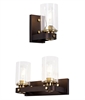 The clear cylindrical glass shades allow the light to shine openly, producing direct illumination that works well along corridors, beside mirrors or in smaller rooms where clarity matters. Each fitting includes subtle brass accents set against a deep bronze frame, adding a refined touch without overwhelming the room.