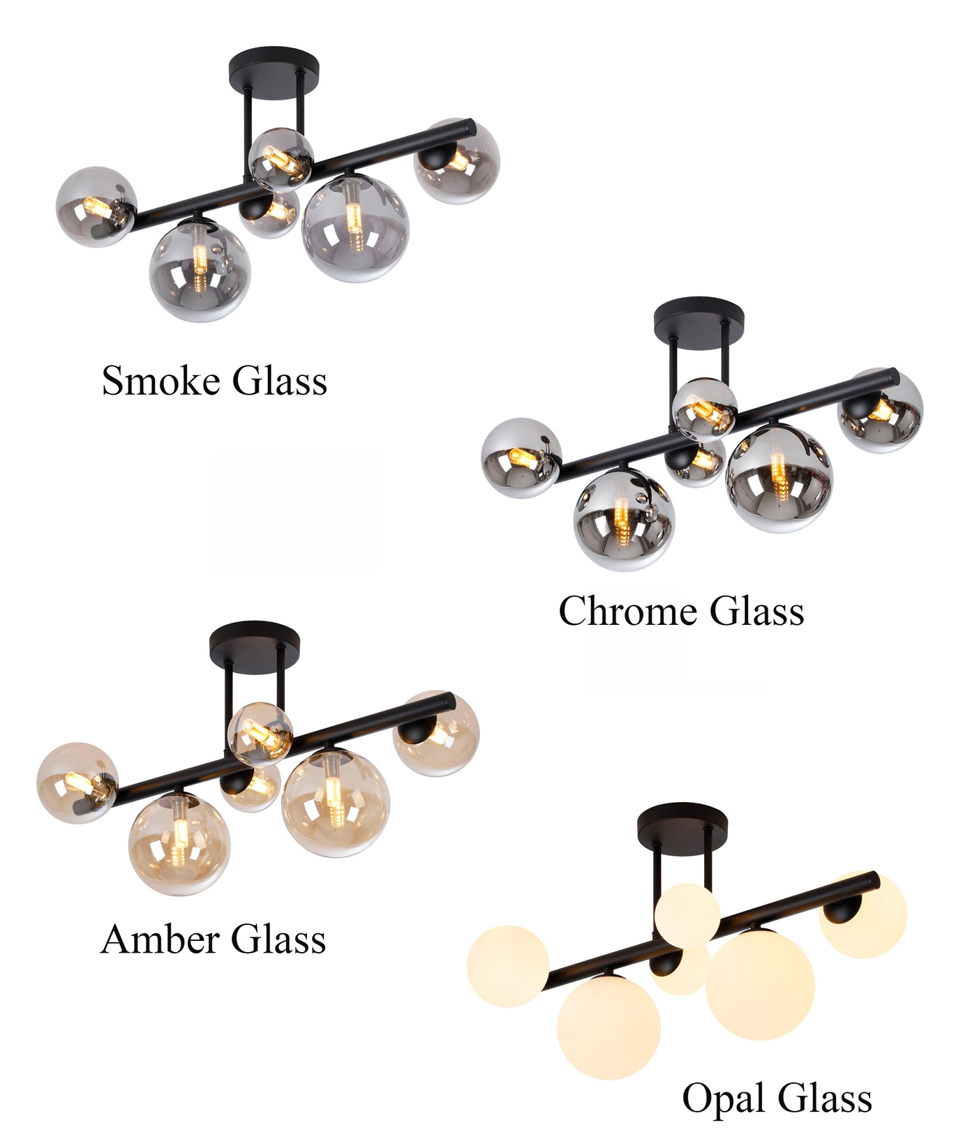 The six glass globe shades, available in smoke, chrome, amber, or opal glass, create a dynamic lighting effect. The transparent and reflective finishes enhance brightness, while the opal option provides a softer, diffused glow.