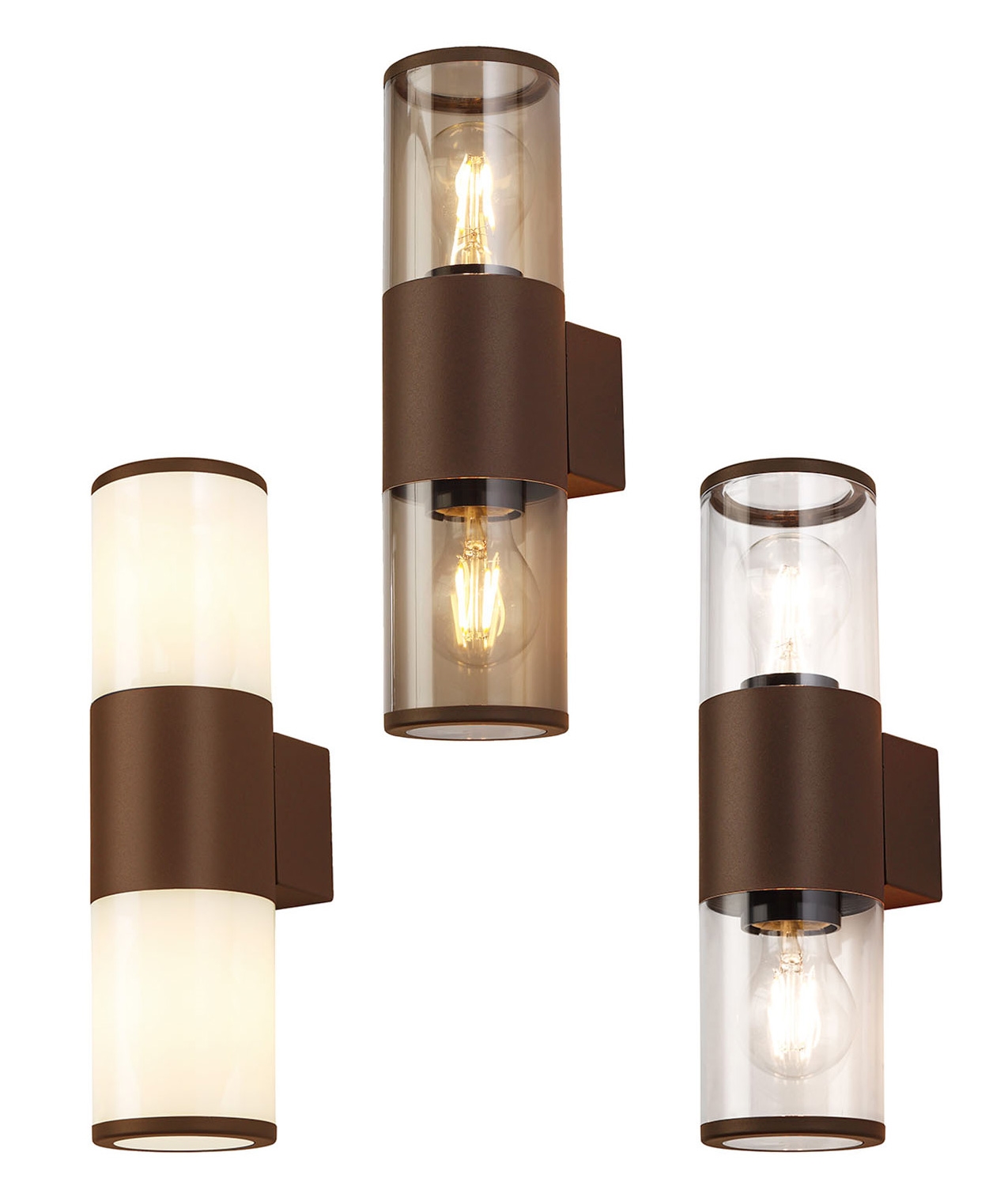 £89.00 inc VATA durable up and down illuminated outdoor IP54-rated wall light with a sleek tubular design. Its clear, opal or smoked polycarbonate diffuser is framed by robust die-cast aluminium in anthracite or matt brown, offering a refined modern look while revealing the E27 bulbs inside. Perfect for illuminating entrances, pathways and exterior walls, it delivers reliable weather protection and stylish, diffused light wherever needed.