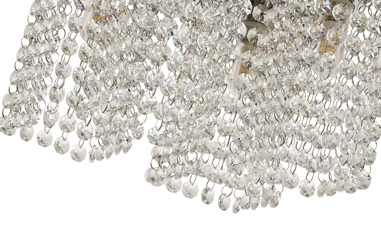 While crystal drops are often used in lighting, this range elevates the design by arranging the pieces into precise square forms. Combined with the abundance of crystals on each strand, this creates a dramatic cube of light surrounding the G9 lamp holders. Once lit, the bulbs refract beautifully through the crystals, casting shimmering, multi-faceted patterns across the room.