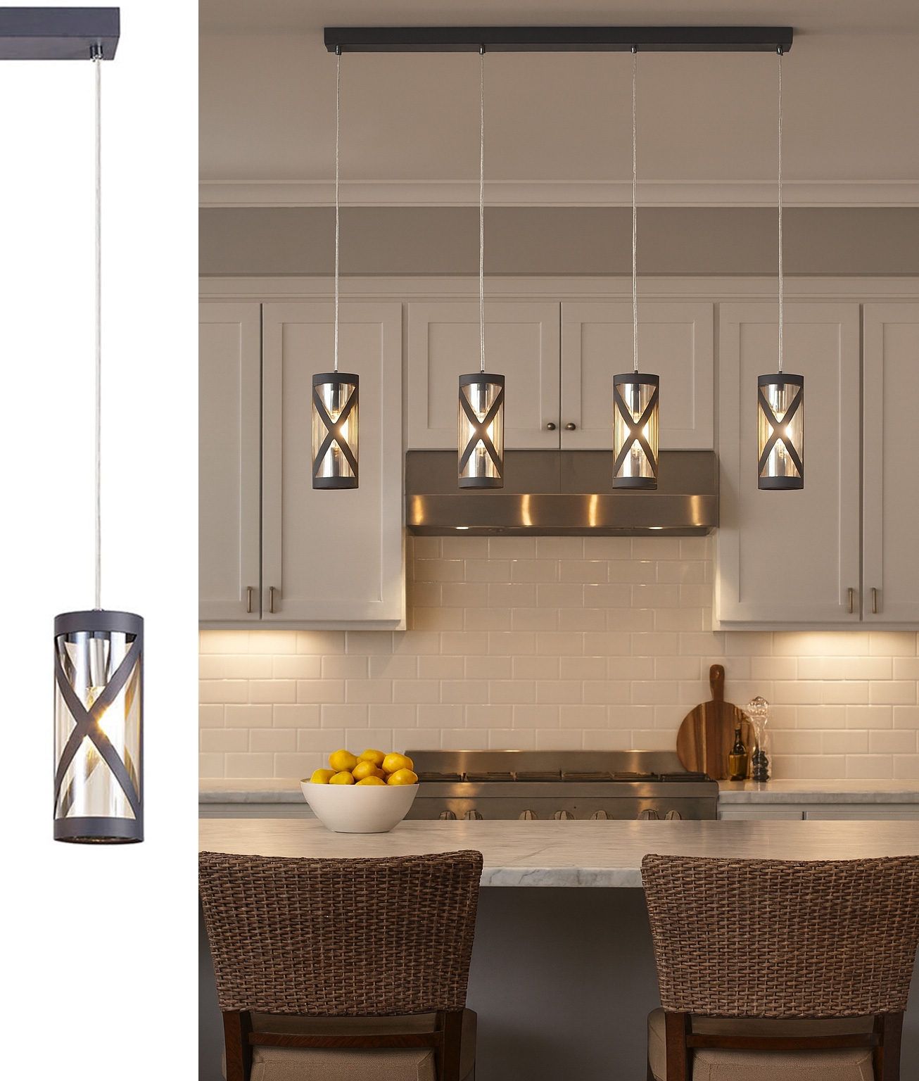 £166.00 inc VATAn exquisitely intricate frame crosses over the tinted cylindrical glass which houses E14 lamp holders. All seven designs in the Menato range are available in either a matt grey or polished chrome finish with cognac glass or oiled bronze and polished chrome frame with amber glass. The spotlights, linear pendant, 1 and 3 light pendants all follow fairly standard compositions whereas the round pendant 4 light has an innovative feature. The lamp holders are situated at either end of two bars which can be pivoted and turned showing art imitating function replicating a baton concept for increased adjustability.