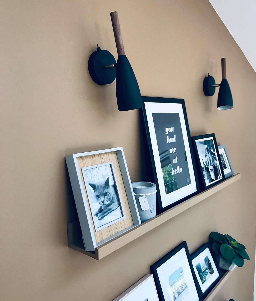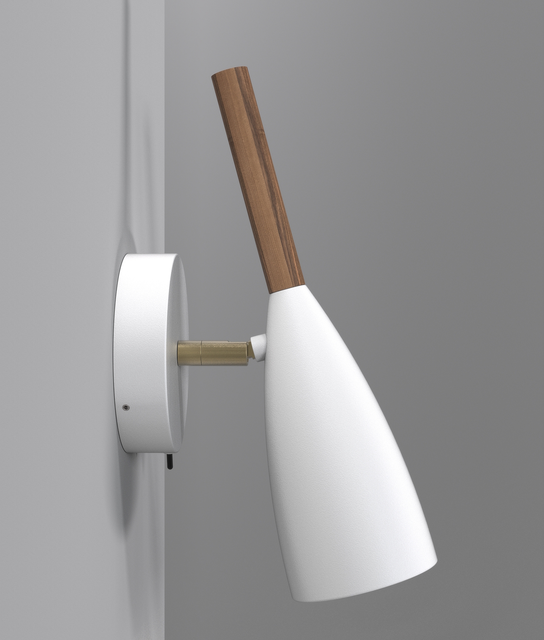 £34.97 inc VATAn elegant, adjustable wall light in a black or white metal finish with a slender and long, oiled, walnut detail on the top of a metal shade.