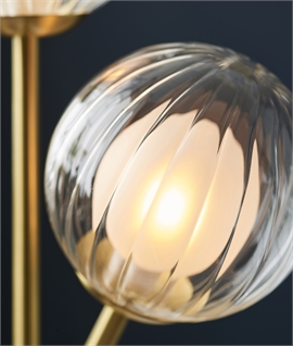 £360.00 inc VATThis mid century modern inspired ceiling light has 6 lamps within ribbed, clear glass globes. They protrude out from the slim, satin brass, linear bar like flower buds on delicate branches.