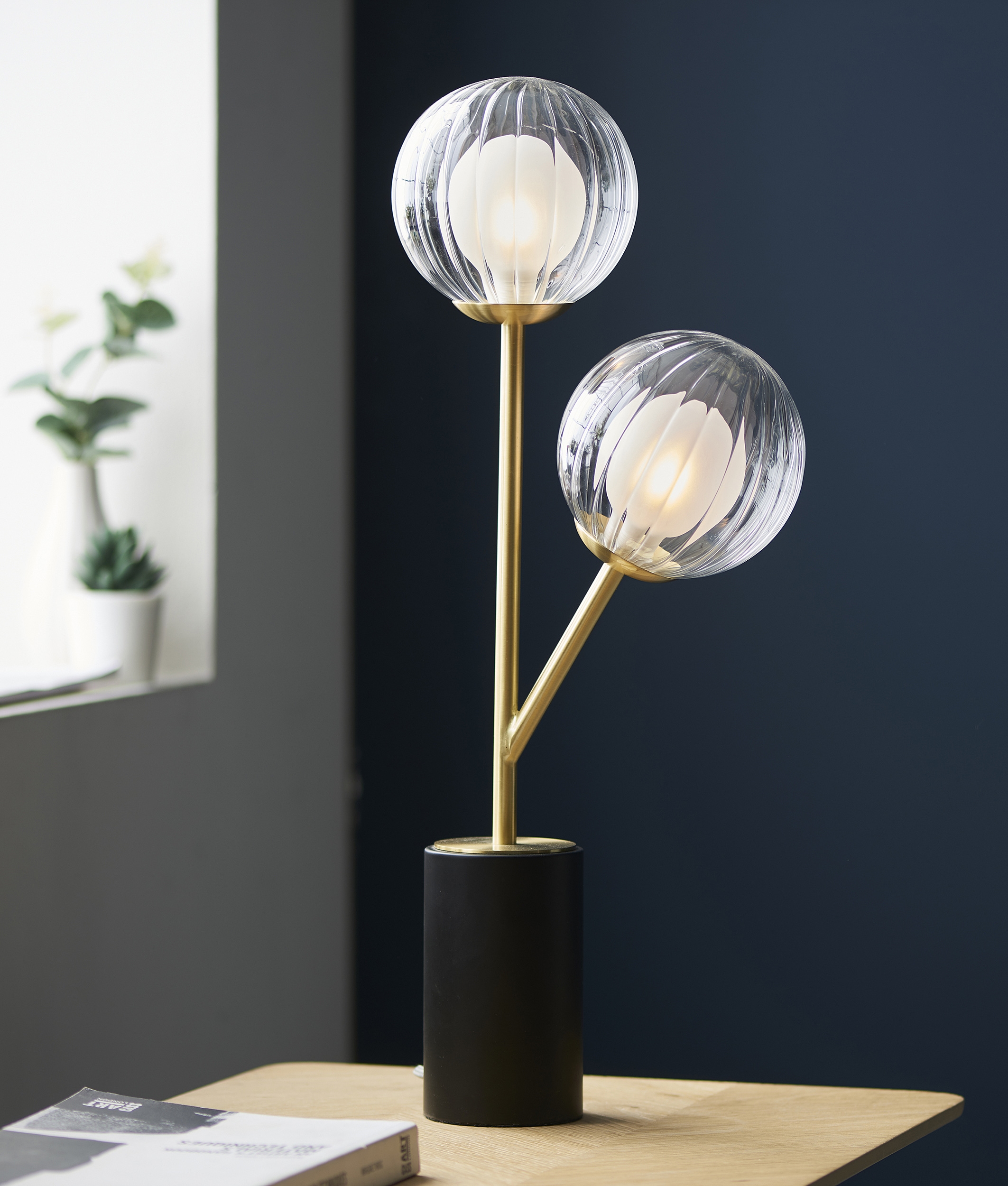 £132.00 inc VATThis mid century modern inspired table light has 2 lamps within ribbed, clear glass globes. They protrude out from the cylindrical, matt black base on slim, satin brass, stems like flower buds on delicate branches.