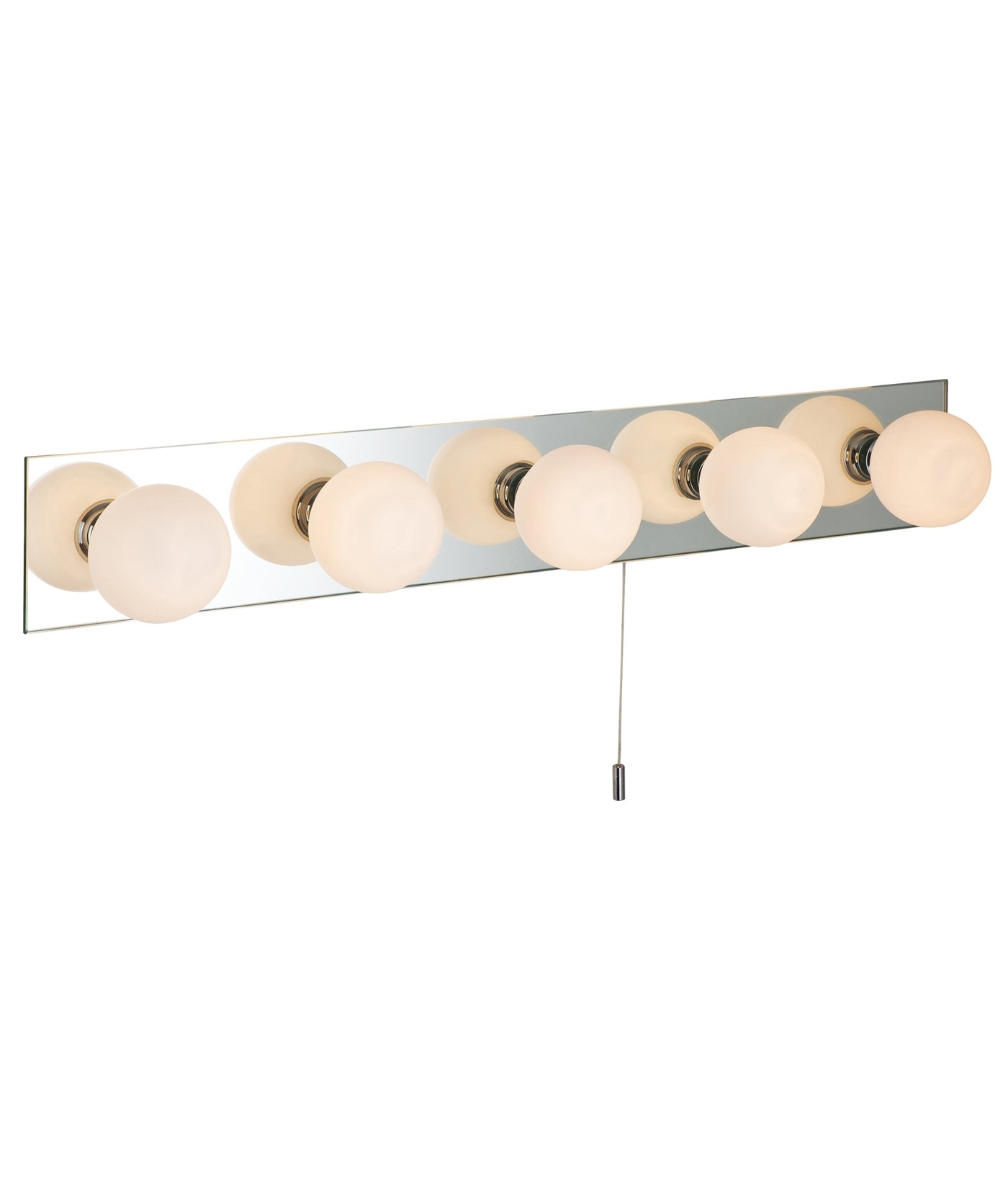 £225.90 inc VATThis IP44-rated wall light features a sleek mirrored back plate paired with five opal glass globe shades. Designed for bathroom use, it offers reliable protection against moisture while providing even, diffused illumination that reduces harsh shadows — ideal for grooming or applying makeup.