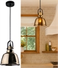 This pendant light features a bell-shaped shade formed from mirror-finished glass in a warm gold tone. The reflective surface offers a striking appearance when unlit and a soft, glowing transparency once illuminated, revealing the internal lamp. A black stirrup-style support, bronze-toned fixings, and a textured lampholder complete the industrial-inspired detailing, giving the pendant a retro character suited to both modern and traditional interiors.