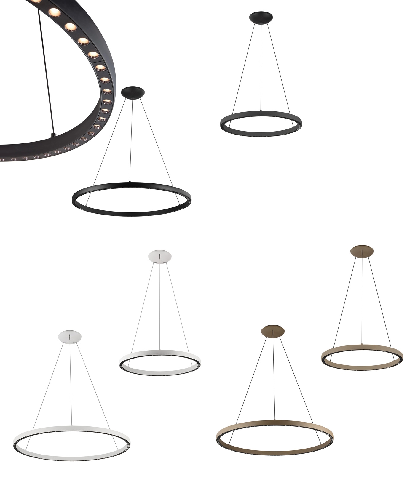 This ring pendant light features a precision-engineered aluminium frame with a circular profile, available in diameters of 62cm and 92cm. The design integrates high-efficiency LEDs and advanced optics to minimise glare and maximise performance. The underside optics deliver a focused 36° beam angle, ideal for task lighting, while the upward lighting utilises a broad 110° beam for ambient illumination. The fixture is finished in three contemporary colours—black, white, and sand—for seamless integration into a range of architectural interiors.