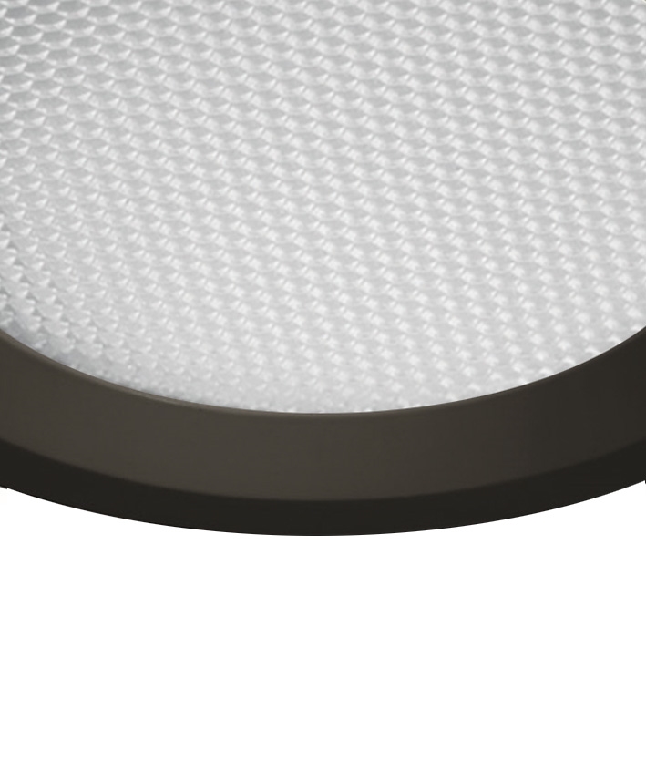 This recessed downlight uses a flat circular form with a black bezel surrounding a centred edge lit disc. The diffuser has a patterned structure that supports UGR19 compliance by softening the output and reducing discomfort glare. The low profile design creates a neat finish in ceilings that benefit from a clean, understated appearance.